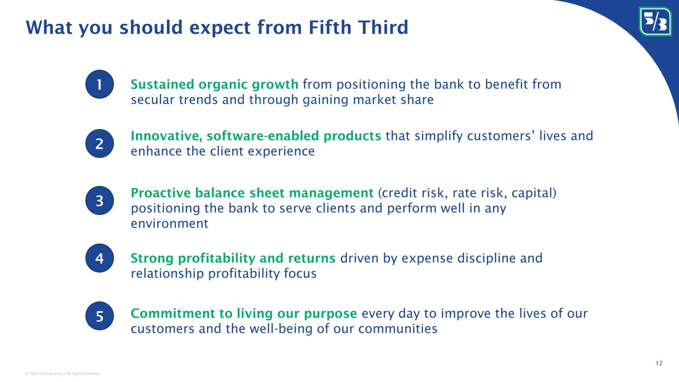 © Fifth Third Bancorp | All Rights Reserved 12 1 Innovative, software-enabled products that simplify customers’ lives and enhance the client experience Sustained organic growth from positioning the bank to benefit from secular trends and through gaining market share Proactive balance sheet management (credit risk, rate risk, capital) positioning the bank to serve clients and perform well in any environment Commitment to living our purpose every day to improve the lives of our customers and the well-being of our communities Strong profitability and returns driven by expense discipline and relationship profitability focus What you should expect from Fifth Third 2 3 4 5