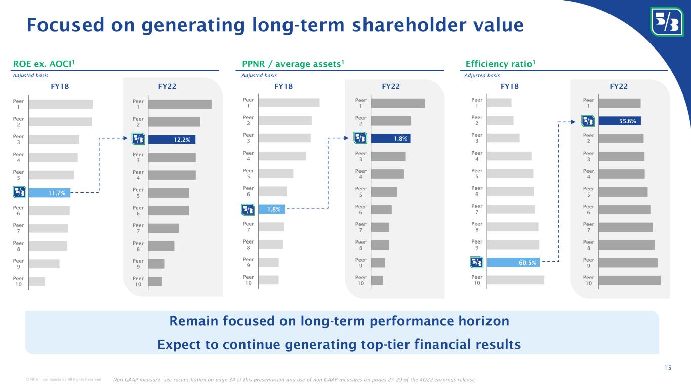 © Fifth Third Bancorp | All Rights Reserved 1. JPMorgan Chase 3,666 1. JPMorgan Chase 1,185 1. JPMorgan Chase 2,340 1. JPMorgan Chase 501 1. Wells Fargo 7,725 2. Bank of America 3,051 2. Bank of America 1,082 2. Bank of America 1,930 2. Bank of America 382 2. JPMorgan Chase 5,135 3. Citigroup 2,417 3. Wells Fargo 962 3. Wells Fargo 1,384 3. Citigroup 196 3. Bank of America 2,893 4. Wells Fargo 1,881 4. Citigroup 681 4. Citigroup 1,382 4. Wells Fargo 144 4. Citigroup 1,253 5. U.S. Bank 675 5. U.S. Bank 390 5. U.S. Bank 525 5. PNC 144 5. Capital One 923 6. PNC 557 6. Truist 327 6. PNC 436 6. U.S. Bank 102 6. PNC 852 7. Truist 555 7. PNC 327 7. Truist 413 7. Truist 69 7. U.S. Bank 766 8. Capital One 455 8. Capital One 313 8. Capital One 333 8. Key 46 8. Fifth Third 609 9. Citizens 227 9. First Republic 167 9. Citizens 181 9. Fifth Third 45 9. Regions 365 10. First Republic 213 10. Citizens 158 10. First Republic 176 10. Regions 44 10. Key 312 11. Silicon Valley Bank 212 11. M&T 132 11. Silicon Valley Bank 173 11. Commerce 37 11. First Premier 258 12. Fifth Third 207 12. Fifth Third 122 12. Fifth Third 164 12. M&T 36 12. Truist 210 13. M&T 201 13. Key 121 13. M&T 164 13. City National 25 13. First National 201 14. Key 190 14. Huntington 121 14. Huntington 148 14. BOKF 24 14. MetaBank 140 15. Huntington 183 15. Regions 97 15. Key 143 15. Huntington 22 15. Silicon Valley Bank 138 16. Regions 156 16. Signature 75 16. Regions 132 16. First Horizon 21 16. Credit One 138 17. Signature 110 17. Silicon Valley Bank 74 17. First Citizens 89 17. Comerica 19 17. Citizens 122 18. First Citizens 109 18. First Citizens 71 18. Signature 89 18. Frost Bank 17 18. The Bancorp Bank 116 19. Zions 90 19. Zions 56 19. Zions 72 19. Synovus 16 19. NABC3 90 20. Comerica 85 20. Western Alliance 54 20. Comerica 71 20. Amalgamated 13 20. Zions 90 ACH Originations2 ($B)Total Assets1 ($B) Loans1 ($B) Deposits1 ($B) Assets Under Management1 ($B) One of the largest U.S. financial institutions across lending, deposits, investments, and payments Note: Data as of 4Q22; Rankings consist of US commercial banks and exclude foreign, trust ,& traditional investment banks. 1 Source: Company filings, 2 Source: Nacha annual rankings of top 50 financial institutions, published April 5, 2022; defined as total ACH originators; 3 North American Banking Company 14 C a t e g o r y I C a t e g o r y I I I C a t e g o r y I V O t h e r