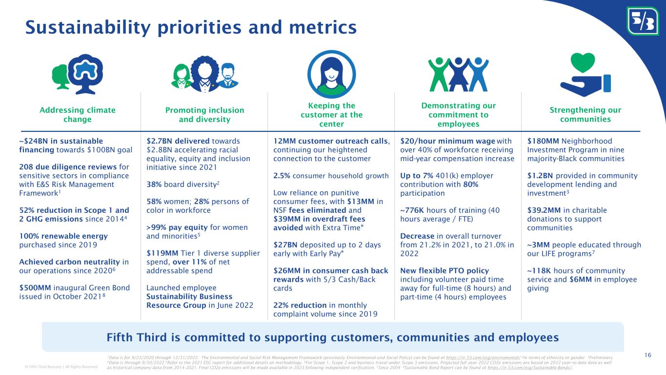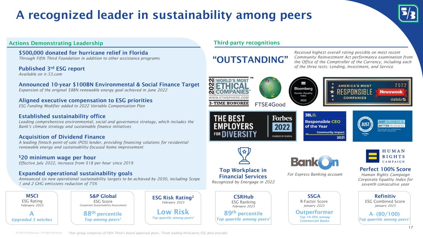 © Fifth Third Bancorp | All Rights Reserved ~$24BN in sustainable financing towards $100BN goal 208 due diligence reviews for sensitive sectors in compliance with E&S Risk Management Framework 1 52% reduction in Scope 1 and 2 GHG emissions since 2014 4 100% renewable energy purchased since 2019 Achieved carbon neutrality in our operations since 2020 6 $500MM inaugural Green Bond issued in October 2021 8 16 Addressing climate change Promoting inclusion and diversity Demonstrating our commitment to employees Strengthening our communities Keeping the customer at the center $180MM Neighborhood Investment Program in nine majority-Black communities $1.2BN provided in community development lending and investment 3 $39.2MM in charitable donations to support communities ~3MM people educated through our LIFE programs 7 ~118K hours of community service and $6MM in employee giving $20/hour minimum wage with over 40% of workforce receiving mid-year compensation increase Up to 7% 401(k) employer contribution with 80% participation ~776K hours of training (40 hours average / FTE) Decrease in overall turnover from 21.2% in 2021, to 21.0% in 2022 New flexible PTO policy including volunteer paid time away for full-time (8 hours) and part-time (4 hours) employees 12MM customer outreach calls, continuing our heightened connection to the customer 2.5% consumer household growth Low reliance on punitive consumer fees, with $13MM in NSF fees eliminated and $39MM in overdraft fees avoided with Extra Time ® $27BN deposited up to 2 days early with Early Pay ® $26MM in consumer cash back rewards with 5/3 Cash/Back cards 22% reduction in monthly complaint volume since 2019 $2.7BN delivered towards $2.8BN accelerating racial equality, equity and inclusion initiative since 2021 38% board diversity 2 58% women; 28% persons of color in workforce >99% pay equity for women and minorities 5 $119MM Tier 1 diverse supplier spend, over 11% of net addressable spend Launched employee Sustainability Business Resource Group in June 2022 Fifth Third is committed to supporting customers, communities and employees Sustainability priorities and metrics 1 Data is for 9/23/2020 through 12/31/2022. The Environmental and Social Risk Management Framework (previously Environmental and Social Policy) can be found at https://ir.53.com/esg/enviromental/ 2 In terms of ethnicity or gender 3 Preliminary 4 Data is through 9/30/2022 5 Refer to the 2021 ESG report for additional details on methodology. 6 For Scope 1, Scope 2 and business travel under Scope 3 emissions. Projected full year 2022 CO2e emissions are based on 2022 year-to-date data as well as historical company data from 2014-2021. Final CO2e emissions will be made available in 2023 following independent verification. 7 Since 2004 8 Sustainable Bond Report can be found at https://ir.53.com/esg/Sustainable-Bonds/.