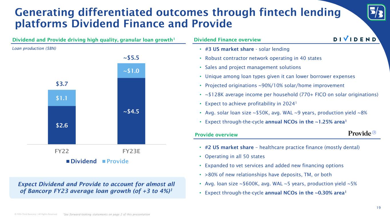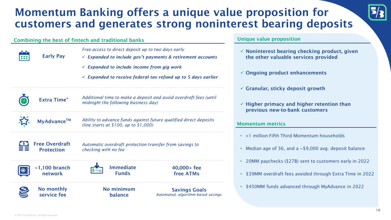 © Fifth Third Bancorp | All Rights Reserved Combining the best of fintech and traditional banks Free access to direct deposit up to two days early ✓ Expanded to include gov’t payments & retirement accounts ✓ Expanded to include income from gig work ✓ Expanded to receive federal tax refund up to 5 days earlier • >1 million Fifth Third Momentum households • Median age of 36, and a ~$9,000 avg. deposit balance • 20MM paychecks ($27B) sent to customers early in 2022 • $39MM overdraft fees avoided through Extra Time in 2022 • $450MM funds advanced through MyAdvance in 2022 Momentum metrics Early Pay Extra Time ® Additional time to make a deposit and avoid overdraft fees (until midnight the following business day) MyAdvance TM Immediate Funds Ability to advance funds against future qualified direct deposits (line starts at $100, up to $1,000) No monthly service fee No minimum balance 40,000+ fee free ATMs ~1,100 branch network Automated, algorithm-based savings Savings Goals Free Overdraft Protection Automatic overdraft protection transfer from savings to checking with no fee Momentum Banking offers a unique value proposition for customers and generates strong noninterest bearing deposits 18 Unique value proposition ✓ Noninterest bearing checking product, given the other valuable services provided ✓ Ongoing product enhancements ✓ Granular, sticky deposit growth ✓ Higher primacy and higher retention than previous new-to-bank customers