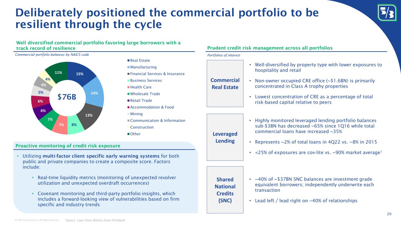 © Fifth Third Bancorp | All Rights Reserved 0.38% 0% 1% 2% 3% 4% 5% 1Q04 1Q08 4Q12 1Q20 4Q22 0.22% 0% 2% 4% 6% 8% 1Q04 1Q08 4Q12 1Q20 4Q22 0.42% 0% 1% 2% 3% 4% 5% 1Q04 1Q08 4Q12 1Q20 4Q22 0.13% 0% 4% 8% 12% 1Q04 1Q08 4Q12 1Q20 4Q22 Significantly improved credit profile Non-Performing Loans 1 Total Net Charge-Offs 2 Consumer Net Charge-Offs 2 Commercial Net Charge-Offs 2 • Centralized credit underwriting, with strict industry and geography concentration limits • Exited certain CRE segments and have maintained lowest CRE concentration among peers • Improved client selection discipline around borrowers with demonstrated character, experience and access to capital • Focused corporate banking coverage on targeted industry verticals with specialized coverage, underwriting, and risk support • Established a special assets group to manage higher risk assets • Exited $5B in commercial loans given through-the-cycle risk/return requirements • Halted national indirect commercial lease originations (~$2B) • Exited commodity trader lending • Sold residential mortgage TDR portfolio • Changed credit card strategy, focusing on in- footprint prime and super prime transactors 1 Source: S&P Global Market Intelligence; 2 Source: Company filings Select actions taken since the financial crisis: Pre-crisis average: 0.48% Financial crisis average: 2.30% Pre-pandemic average: 0.44% Pre-crisis average: 0.48% Financial crisis average: 2.62% Pre-pandemic average: 0.65% Pre-crisis average: 0.38% Financial crisis average: 2.41% Pre-pandemic average: 0.33% Pre-crisis average: 0.60% Financial crisis average: 2.21% Pre-pandemic average: 0.62% 22