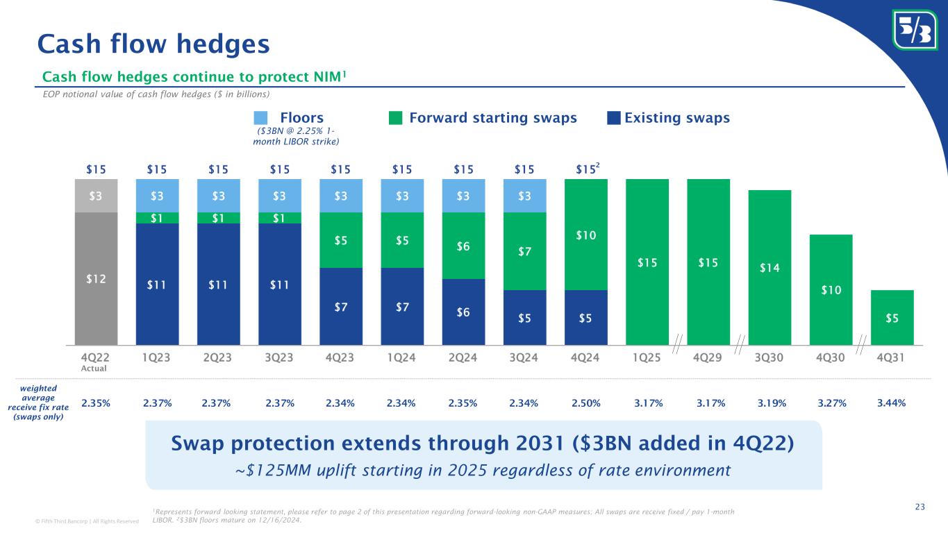 © Fifth Third Bancorp | All Rights Reserved 23 ($3BN @ 2.25% 1- month LIBOR strike) Cash flow hedges continue to protect NIM 1 EOP notional value of cash flow hedges ($ in billions) Actual Cash flow hedges 1 Represents forward looking statement, please refer to page 2 of this presentation regarding forward-looking non-GAAP measures; All swaps are receive fixed / pay 1-month LIBOR. 2 $3BN floors mature on 12/16/2024. Swap protection extends through 2031 ($3BN added in 4Q22) ~$125MM uplift starting in 2025 regardless of rate environment Floors Forward starting swaps Existing swaps weighted average receive fix rate (swaps only) 2.35% 2.37% 2.37% 3.27%2.37% 2.35%2.34% 2.34% 2.34% 2.50% 3.17% 3.17% 3.19% 3.44% 2