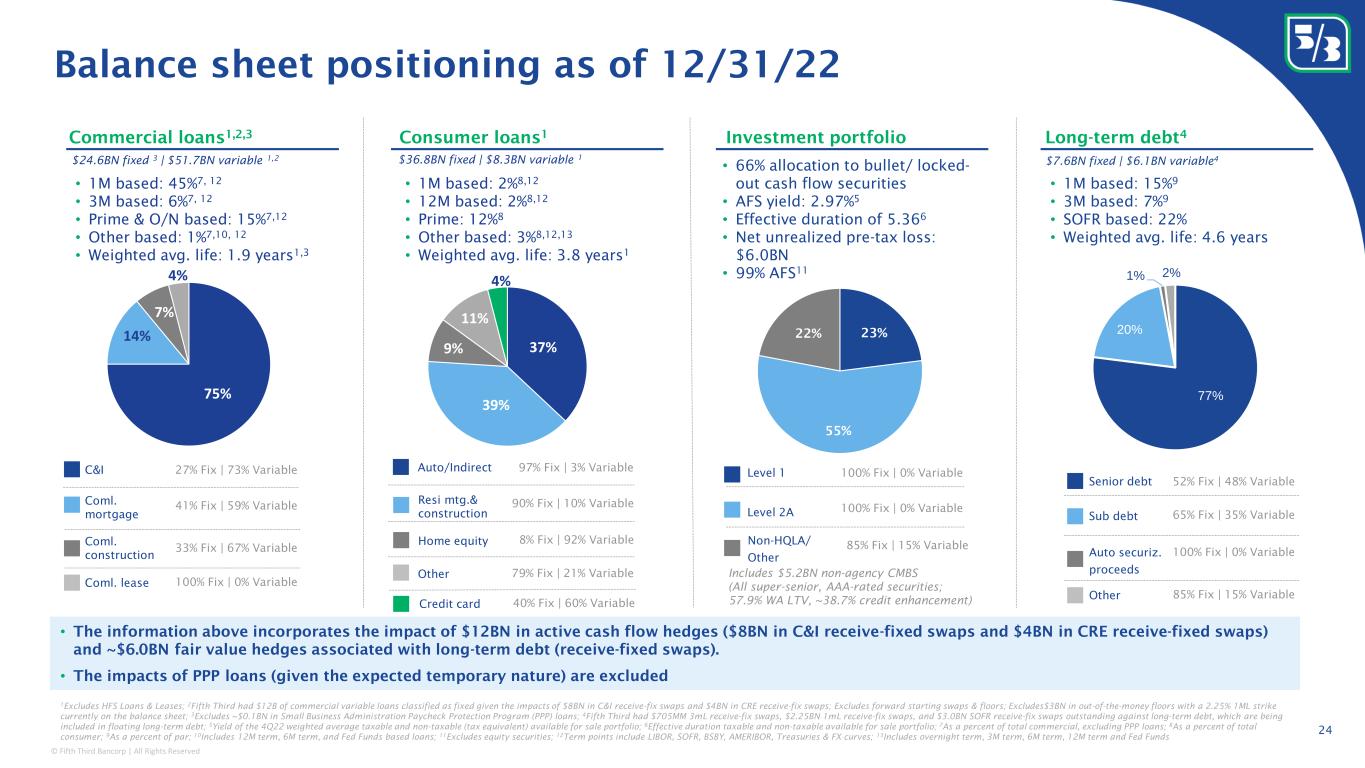 © Fifth Third Bancorp | All Rights Reserved 37% 39% 9% 11% 4% 75% 14% 7% 4% • 66% allocation to bullet/ locked- out cash flow securities • AFS yield: 2.97% 5 • Effective duration of 5.36 6 • Net unrealized pre-tax loss: $6.0BN • 99% AFS 11 $24.6BN fixed 3 | $51.7BN variable 1,2 Commercial loans 1,2,3 Balance sheet positioning as of 12/31/22 24 0% 100% Fix | 0% Variable 85% Fix | 15% Variable Investment portfolioConsumer loans 1 Long-term debt 4 $36.8BN fixed | $8.3BN variable 1 $7.6BN fixed | $6.1BN variable 4 • 1M based: 45% 7, 12 • 3M based: 6% 7, 12 • Prime & O/N based: 15% 7,12 • Other based: 1% 7,10, 12 • Weighted avg. life: 1.9 years 1,3 • 1M based: 2% 8,12 • 12M based: 2% 8,12 • Prime: 12% 8 • Other based: 3% 8,12,13 • Weighted avg. life: 3.8 years 1 • 1M based: 15% 9 • 3M based: 7% 9 • SOFR based: 22% • Weighted avg. life: 4.6 years C&I 27% Fix | 73% Variable Coml. mortgage 41% Fix | 59% Variable Coml. lease 100% Fix | 0% Variable Resi mtg.& construction 90% Fix | 10% Variable Home equity 8% Fix | 92% Variable Senior debt 52% Fix | 48% Variable Sub debt 65% Fix | 35% Variable Auto securiz. proceeds 100% Fix | 0% Variable Coml. construction 33% Fix | 67% Variable Credit card 40% Fix | 60% Variable Other 79% Fix | 21% Variable Other 85% Fix | 15% Variable Level 1 100% Fix | 0% Variable Level 2A Non-HQLA/ Other • The information above incorporates the impact of $12BN in active cash flow hedges ($8BN in C&I receive-fixed swaps and $4BN in CRE receive-fixed swaps) and ~$6.0BN fair value hedges associated with long-term debt (receive-fixed swaps). • The impacts of PPP loans (given the expected temporary nature) are excluded Includes $5.2BN non-agency CMBS (All super-senior, AAA-rated securities; 57.9% WA LTV, ~38.7% credit enhancement) Auto/Indirect 97% Fix | 3% Variable 23% 55% 22% 77% 20% 1% 2% 1 Excludes HFS Loans & Leases; 2 Fifth Third had $12B of commercial variable loans classified as fixed given the impacts of $8BN in C&I receive-fix swaps and $4BN in CRE receive-fix swaps; Excludes forward starting swaps & floors; Excludes$3BN in out-of-the-money floors with a 2.25% 1ML strike currently on the balance sheet; 3 Excludes ~$0.1BN in Small Business Administration Paycheck Protection Program (PPP) loans; 4 Fifth Third had $705MM 3mL receive-fix swaps, $2.25BN 1mL receive-fix swaps, and $3.0BN SOFR receive-fix swaps outstanding against long-term debt, which are being included in floating long-term debt; 5 Yield of the 4Q22 weighted average taxable and non-taxable (tax equivalent) available for sale portfolio; 6 Effective duration taxable and non-taxable available for sale portfolio; 7 As a percent of total commercial, excluding PPP loans; 8 As a percent of total consumer; 9 As a percent of par; 10 Includes 12M term, 6M term, and Fed Funds based loans; 11 Excludes equity securities; 12 Term points include LIBOR, SOFR, BSBY, AMERIBOR, Treasuries & FX curves; 13 Includes overnight term, 3M term, 6M term, 12M term and Fed Funds