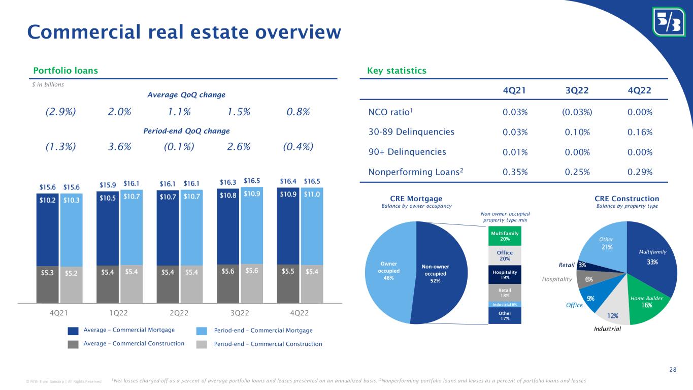 © Fifth Third Bancorp | All Rights Reserved Classification: Internal Use 4Q21 3Q22 4Q22 NCO ratio 1 0.11% 0.24% 0.14% 30-89 Delinquencies 0.14% 0.22% 0.14% 90+ Delinquencies 0.03% 0.03% 0.02% Nonperforming Loans 2 0.54% 0.45% 0.38% 27 Portfolio loans $ in billions Period-end QoQ change Average QoQ change Key statistics Revolving Line Utilization Trend 3 Commercial & industrial overview 3.8% 6.0% 5.5% 2.1% 1.8% 8.0% 4.4% 4.1% 0.6% 1.4% Average - C&I Period-end C&I 1 Net losses charged-off as a percent of average portfolio loans and leases presented on an annualized basis. 2 Nonperforming portfolio loans and leases as a percent of portfolio loans and leases 3 Total commercial portfolio line utilization