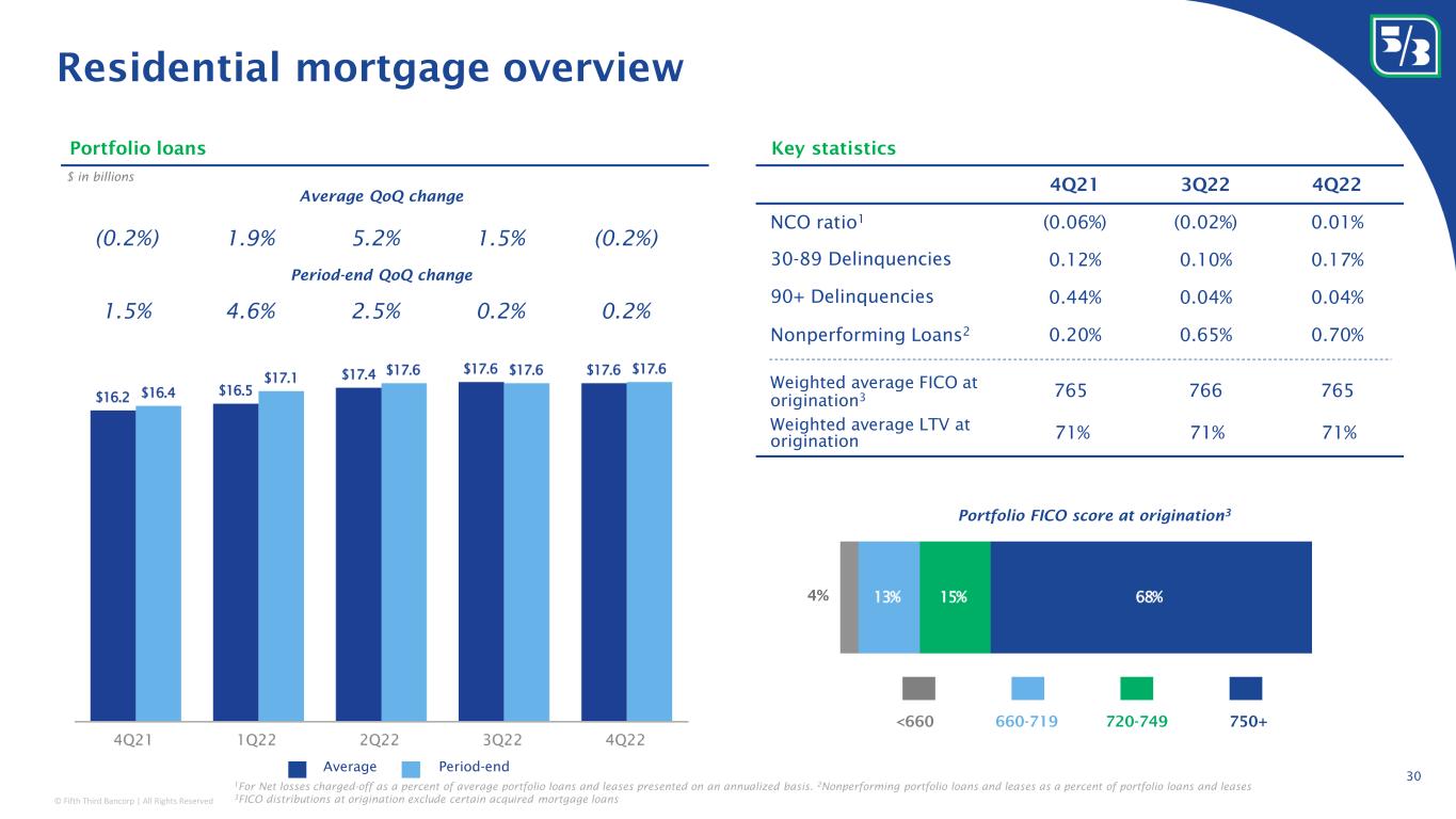 © Fifth Third Bancorp | All Rights Reserved 4Q21 3Q22 4Q22 NCO ratio 1 0.21% 0.28% 0.38% 30-89 Delinquencies 0.43% 0.43% 0.57% 90+ Delinquencies 0.23% 0.07% 0.06% Nonperforming Loans 2 0.39% 0.51% 0.56% Weighted average FICO at origination 3 765 765 765 Weighted average LTV at origination 4 74% 80% 78% Total consumer portfolio overview 29 Portfolio FICO score at origination 3 $ in billions; including HFS Total loans Key statistics Period-end QoQ change Average QoQ change 0.1% (1.8%) 0.2% 0.6% (0.4%) (0.5%) (1.4%) 1.7% (0.5%) (0.1%) 750+720-749<660 660-719 4% Period-end Consumer loansAverage Consumer loans 1 For Net losses charged-off as a percent of average portfolio loans and leases presented on an annualized basis. 2 Nonperforming portfolio loans and leases as a percent of portfolio loans and leases 3 FICO distributions at origination exclude certain acquired consumer loans; 4 Portfolios include home equity, residential mortgage, & indirect secured consumer