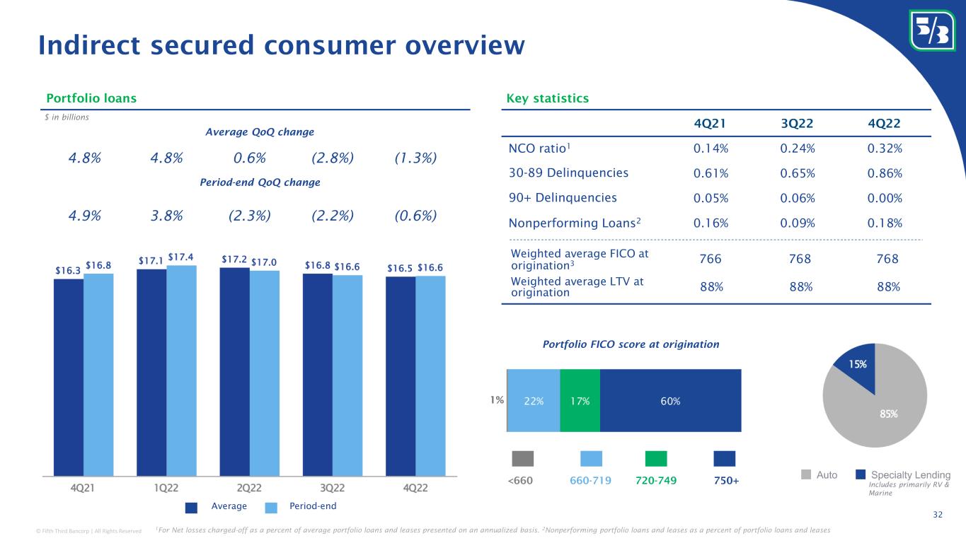 © Fifth Third Bancorp | All Rights Reserved Classification: Internal Use 4Q21 3Q22 4Q22 NCO ratio 1 (0.18%) (0.08%) 0.02% 30-89 Delinquencies 0.61% 0.55% 0.74% 90+ Delinquencies 0.02% 0.03% 0.02% Nonperforming Loans 2 1.89% 1.70% 1.66% Weighted average FICO at origination 3 763 767 767 Weighted average LTV at origination 68% 67% 67% Home equity overview 31 Portfolio FICO score at origination 3 $ in billions Portfolio loans Key statistics Period-end QoQ change Average QoQ change (5.2%) (4.1%) (2.8%) 1.6% 1.7% (4.5%) (4.1%) (0.3%) 2.4% 1.0% 750+720-749<660 660-719 2% Period-endAverage 1 For Net losses charged-off as a percent of average portfolio loans and leases presented on an annualized basis. 2 Nonperforming portfolio loans and leases as a percent of portfolio loans and leases 3 FICO distributions at origination exclude certain acquired home equity loans
