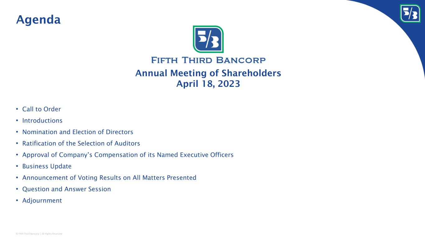 © Fifth Third Bancorp | All Rights Reserved • Call to Order • Introductions • Nomination and Election of Directors • Ratification of the Selection of Auditors • Approval of Company’s Compensation of its Named Executive Officers • Business Update • Announcement of Voting Results on All Matters Presented • Question and Answer Session • Adjournment Annual Meeting of Shareholders April 18, 2023 Agenda