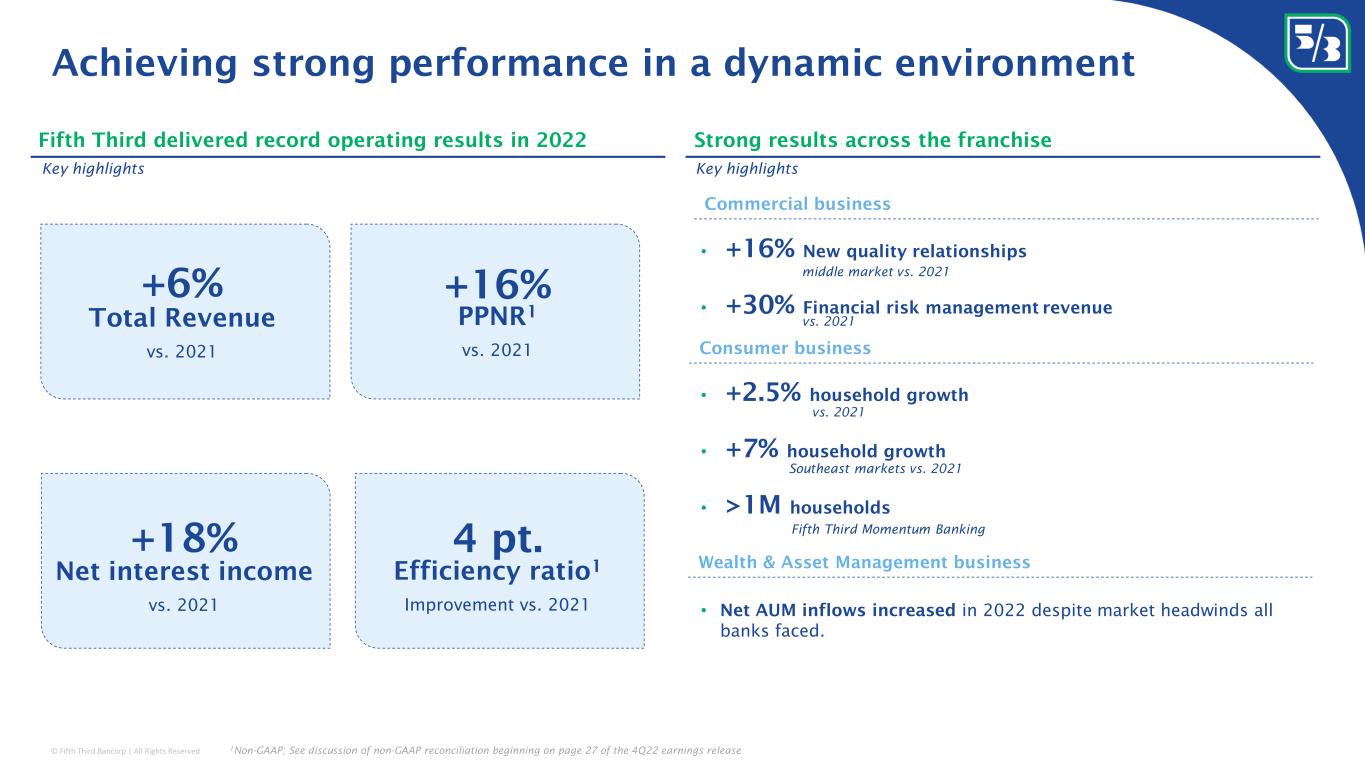 © Fifth Third Bancorp | All Rights Reserved • +2.5% household growth • +7% household growth • >1M households • +16% New quality relationships • +30% Financial risk management revenue Achieving strong performance in a dynamic environment Total Revenue vs. 2021 +6% Net interest income vs. 2021 +18% PPNR 1 vs. 2021 +16% Efficiency ratio 1 Improvement vs. 2021 4 pt. Key highlights Fifth Third delivered record operating results in 2022 Strong results across the franchise Commercial business Consumer business Wealth & Asset Management business Key highlights middle market vs. 2021 vs. 2021 vs. 2021 Southeast markets vs. 2021 Fifth Third Momentum Banking • Net AUM inflows increased in 2022 despite market headwinds all banks faced. 1 Non-GAAP; See discussion of non-GAAP reconciliation beginning on page 27 of the 4Q22 earnings release