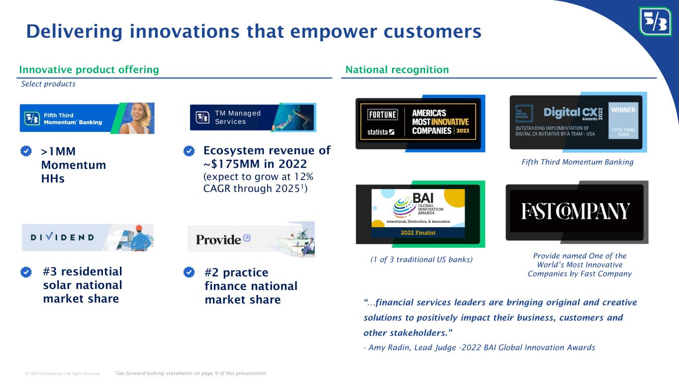 © Fifth Third Bancorp | All Rights Reserved Delivering innovations that empower customers Select products Innovative product offering National recognition (1 of 3 traditional US banks) Fifth Third Momentum Banking Provide named One of the World’s Most Innovative Companies by Fast Company “…financial services leaders are bringing original and creative solutions to positively impact their business, customers and other stakeholders.” - Amy Radin, Lead Judge -2022 BAI Global Innovation Awards >1MM Momentum HHs Ecosystem revenue of ~$175MM in 2022 (expect to grow at 12% CAGR through 2025 1 ) TM Manag ed Serv ices #3 residential solar national market share #2 practice finance national market share 1 See forward-looking statements on page 9 of this presentation