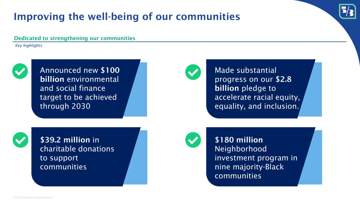 © Fifth Third Bancorp | All Rights Reserved Dedicated to strengthening our communities Improving the well-being of our communities Key highlights Announced new $100 billion environmental and social finance target to be achieved through 2030 $39.2 million in charitable donations to support communities Made substantial progress on our $2.8 billion pledge to accelerate racial equity, equality, and inclusion. $180 million Neighborhood investment program in nine majority-Black communities