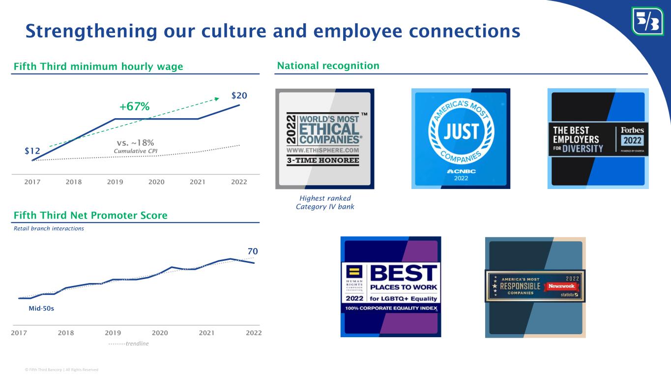 © Fifth Third Bancorp | All Rights Reserved Fifth Third minimum hourly wage Strengthening our culture and employee connections Retail branch interactions 70 2017 2018 2019 2020 2021 2022 Linear (Retail branch) Mid-50s trendline $12 $20 2017 2018 2019 2020 2021 2022 +67% Fifth Third Net Promoter Score National recognition Highest ranked Category IV bank vs. ~18% Cumulative CPI