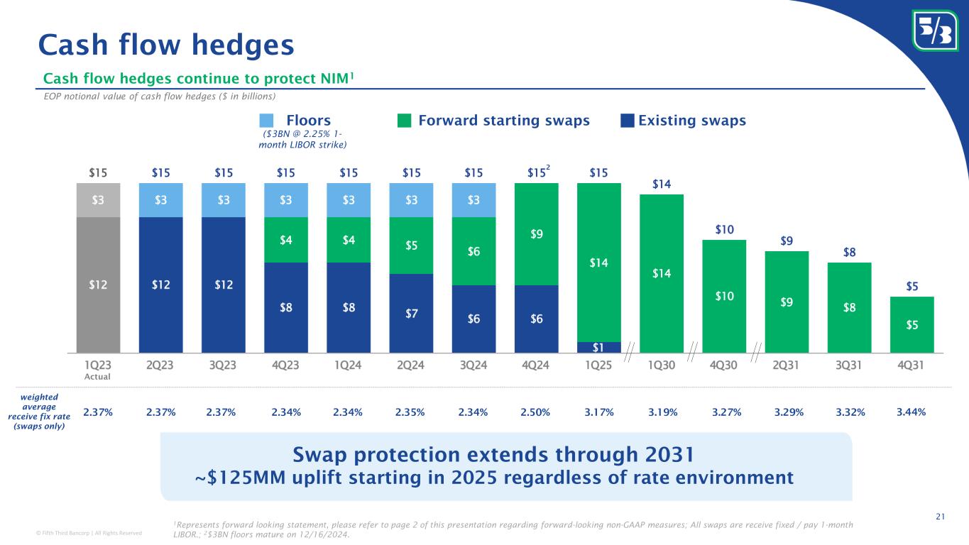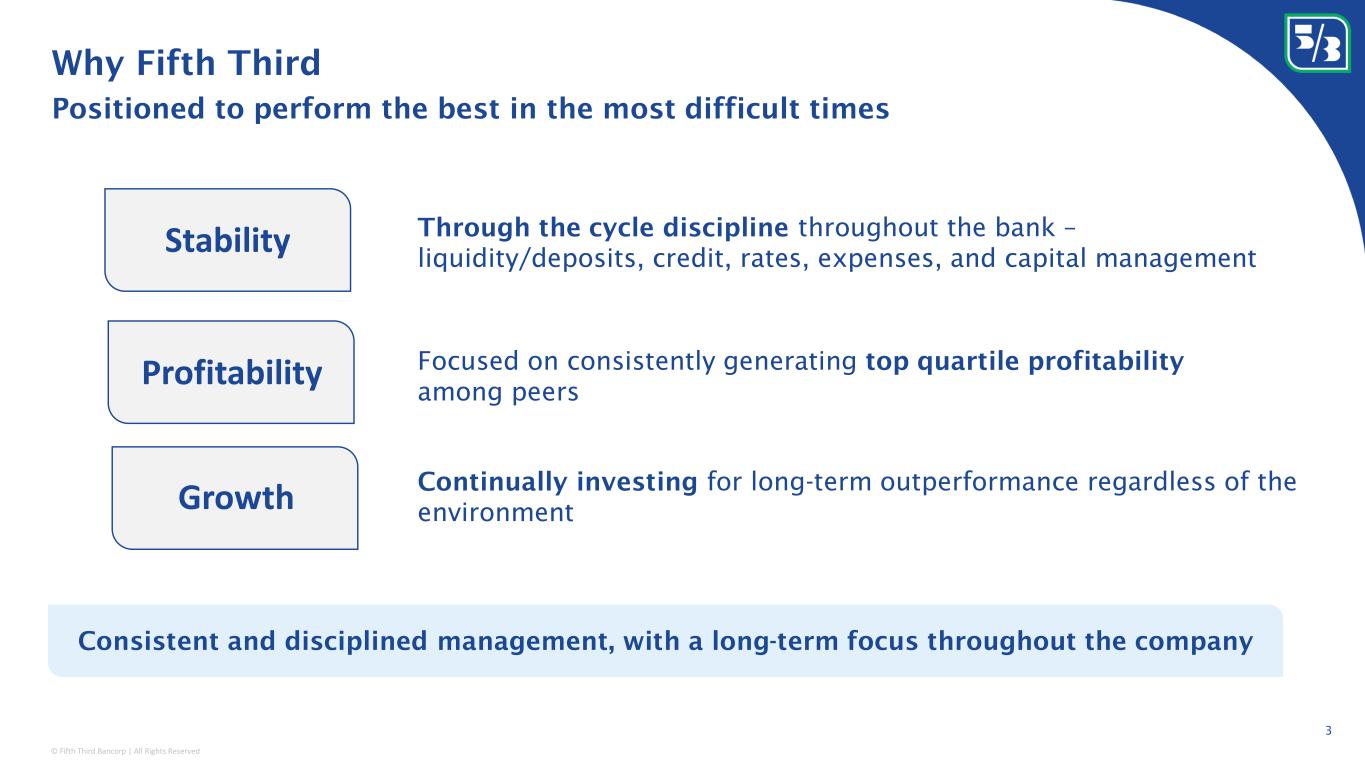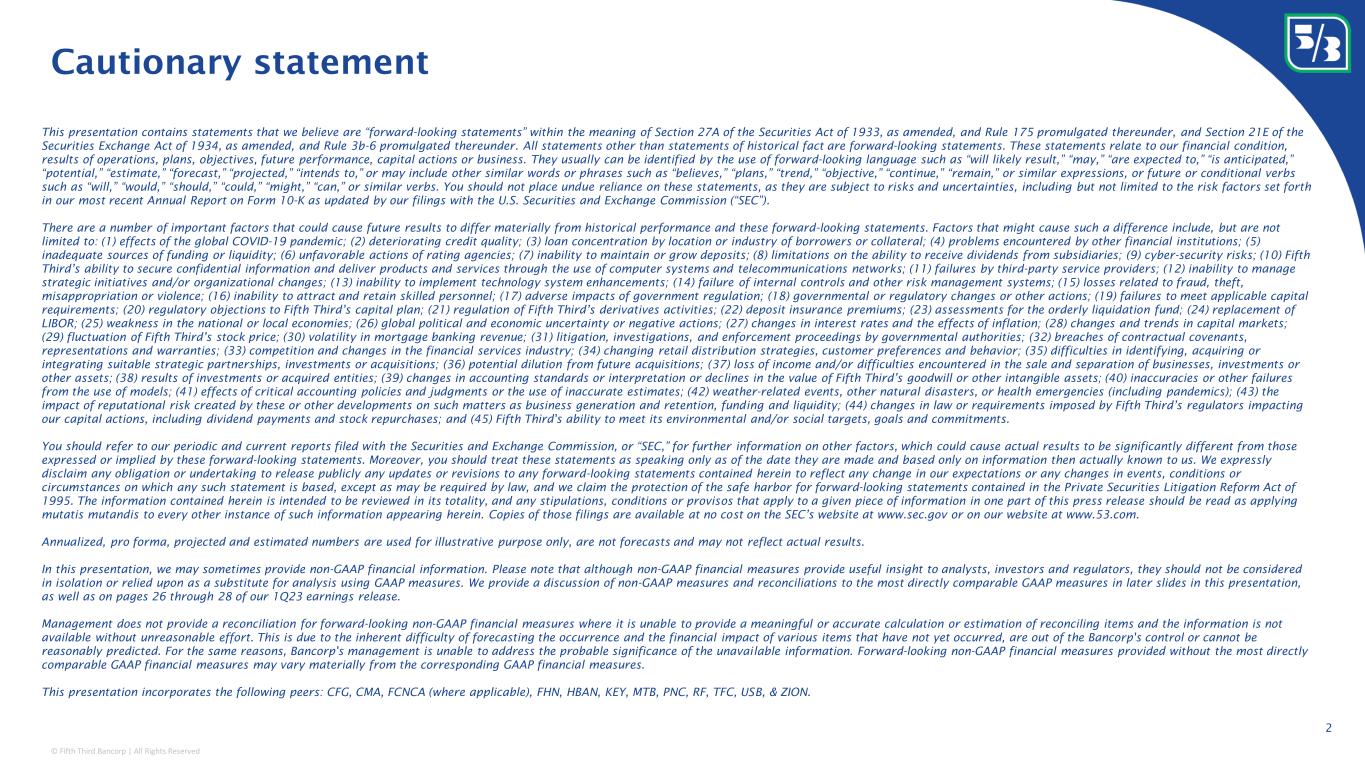 © Fifth Third Bancorp | All Rights Reserved This presentation contains statements that we believe are “forward-looking statements” within the meaning of Section 27A of the Securities Act of 1933, as amended, and Rule 175 promulgated thereunder, and Section 21E of the Securities Exchange Act of 1934, as amended, and Rule 3b-6 promulgated thereunder. All statements other than statements of historical fact are forward-looking statements. These statements relate to our financial condition, results of operations, plans, objectives, future performance, capital actions or business. They usually can be identified by the use of forward-looking language such as “will likely result,” “may,” “are expected to,” “is anticipated,” “potential,” “estimate,” “forecast,” “projected,” “intends to,” or may include other similar words or phrases such as “believes,” “plans,” “trend,” “objective,” “continue,” “remain,” or similar expressions, or future or conditional verbs such as “will,” “would,” “should,” “could,” “might,” “can,” or similar verbs. You should not place undue reliance on these statements, as they are subject to risks and uncertainties, including but not limited to the risk factors set forth in our most recent Annual Report on Form 10-K as updated by our filings with the U.S. Securities and Exchange Commission (“SEC”). There are a number of important factors that could cause future results to differ materially from historical performance and these forward-looking statements. Factors that might cause such a difference include, but are not limited to: (1) effects of the global COVID-19 pandemic; (2) deteriorating credit quality; (3) loan concentration by location or industry of borrowers or collateral; (4) problems encountered by other financial institutions; (5) inadequate sources of funding or liquidity; (6) unfavorable actions of rating agencies; (7) inability to maintain or grow deposits; (8) limitations on the ability to receive dividends from subsidiaries; (9) cyber-security risks; (10) Fifth Third’s ability to secure confidential information and deliver products and services through the use of computer systems and telecommunications networks; (11) failures by third-party service providers; (12) inability to manage strategic initiatives and/or organizational changes; (13) inability to implement technology system enhancements; (14) failure of internal controls and other risk management systems; (15) losses related to fraud, theft, misappropriation or violence; (16) inability to attract and retain skilled personnel; (17) adverse impacts of government regulation; (18) governmental or regulatory changes or other actions; (19) failures to meet applicable capital requirements; (20) regulatory objections to Fifth Third’s capital plan; (21) regulation of Fifth Third’s derivatives activities; (22) deposit insurance premiums; (23) assessments for the orderly liquidation fund; (24) replacement of LIBOR; (25) weakness in the national or local economies; (26) global political and economic uncertainty or negative actions; (27) changes in interest rates and the effects of inflation; (28) changes and trends in capital markets; (29) fluctuation of Fifth Third’s stock price; (30) volatility in mortgage banking revenue; (31) litigation, investigations, and enforcement proceedings by governmental authorities; (32) breaches of contractual covenants, representations and warranties; (33) competition and changes in the financial services industry; (34) changing retail distribution strategies, customer preferences and behavior; (35) difficulties in identifying, acquiring or integrating suitable strategic partnerships, investments or acquisitions; (36) potential dilution from future acquisitions; (37) loss of income and/or difficulties encountered in the sale and separation of businesses, investments or other assets; (38) results of investments or acquired entities; (39) changes in accounting standards or interpretation or declines in the value of Fifth Third’s goodwill or other intangible assets; (40) inaccuracies or other failures from the use of models; (41) effects of critical accounting policies and judgments or the use of inaccurate estimates; (42) weather-related events, other natural disasters, or health emergencies (including pandemics); (43) the impact of reputational risk created by these or other developments on such matters as business generation and retention, funding and liquidity; (44) changes in law or requirements imposed by Fifth Third’s regulators impacting our capital actions, including dividend payments and stock repurchases; and (45) Fifth Third's ability to meet its environmental and/or social targets, goals and commitments. You should refer to our periodic and current reports filed with the Securities and Exchange Commission, or “SEC,” for further information on other factors, which could cause actual results to be significantly different from those expressed or implied by these forward-looking statements. Moreover, you should treat these statements as speaking only as of the date they are made and based only on information then actually known to us. We expressly disclaim any obligation or undertaking to release publicly any updates or revisions to any forward-looking statements contained herein to reflect any change in our expectations or any changes in events, conditions or circumstances on which any such statement is based, except as may be required by law, and we claim the protection of the safe harbor for forward-looking statements contained in the Private Securities Litigation Reform Act of 1995. The information contained herein is intended to be reviewed in its totality, and any stipulations, conditions or provisos that apply to a given piece of information in one part of this press release should be read as applying mutatis mutandis to every other instance of such information a