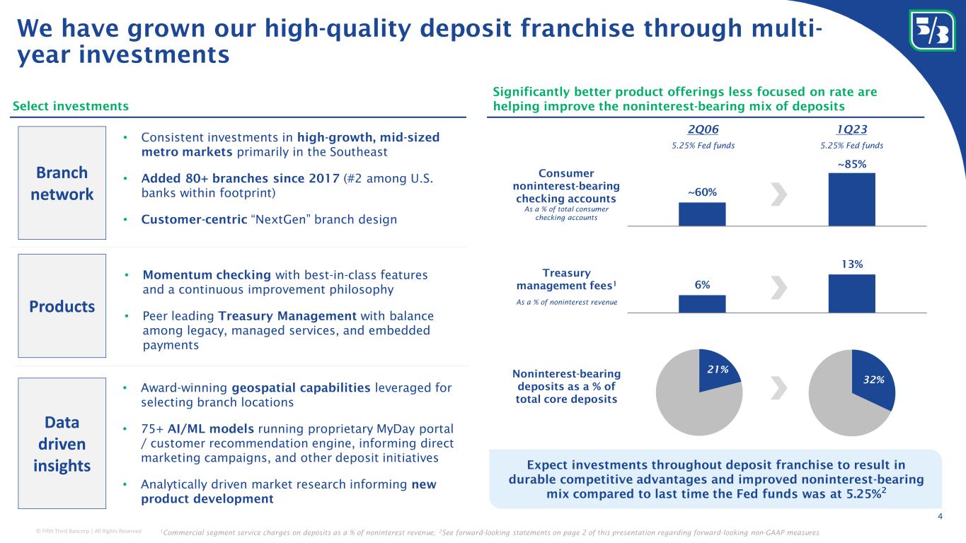 © Fifth Third Bancorp | All Rights Reserved Why Fifth Third Continually investing for long-term outperformance regardless of the environment Through the cycle discipline throughout the bank – liquidity/deposits, credit, rates, expenses, and capital management Focused on consistently generating top quartile profitability among peers Stability Profitability Growth Consistent and disciplined management, with a long-term focus throughout the company 3 Positioned to perform the best in the most difficult times
