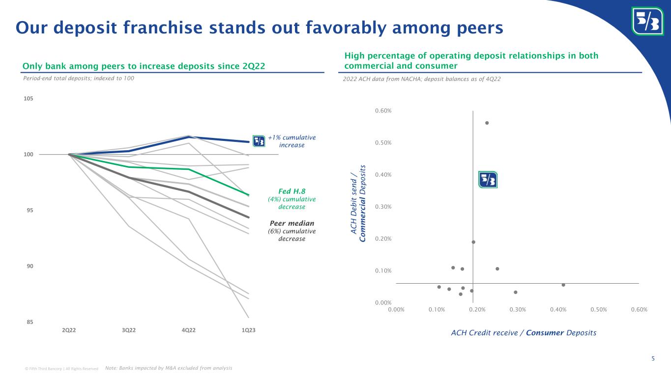 © Fifth Third Bancorp | All Rights Reserved We have grown our high-quality deposit franchise through multi- year investments 4 1 Commercial segment service charges on deposits as a % of noninterest revenue; 2 See forward-looking statements on page 2 of this presentation regarding forward-looking non-GAAP measures Significantly better product offerings less focused on rate are helping improve the noninterest-bearing mix of deposits 21% 32% Noninterest-bearing deposits as a % of total core deposits Treasury management fees 1 As a % of noninterest revenue 6% 13% Expect investments throughout deposit franchise to result in durable competitive advantages and improved noninterest-bearing mix compared to last time the Fed funds was at 5.25% 2 1Q23 5.25% Fed funds Consumer noninterest-bearing checking accounts As a % of total consumer checking accounts ~60% ~85% 2Q06 5.25% Fed funds Select investments • Award-winning geospatial capabilities leveraged for selecting branch locations • 75+ AI/ML models running proprietary MyDay portal / customer recommendation engine, informing direct marketing campaigns, and other deposit initiatives • Analytically driven market research informing new product development • Momentum checking with best-in-class features and a continuous improvement philosophy • Peer leading Treasury Management with balance among legacy, managed services, and embedded payments • Consistent investments in high-growth, mid-sized metro markets primarily in the Southeast • Added 80+ branches since 2017 (#2 among U.S. banks within footprint) • Customer-centric “NextGen” branch design Branch network Products Data driven insights
