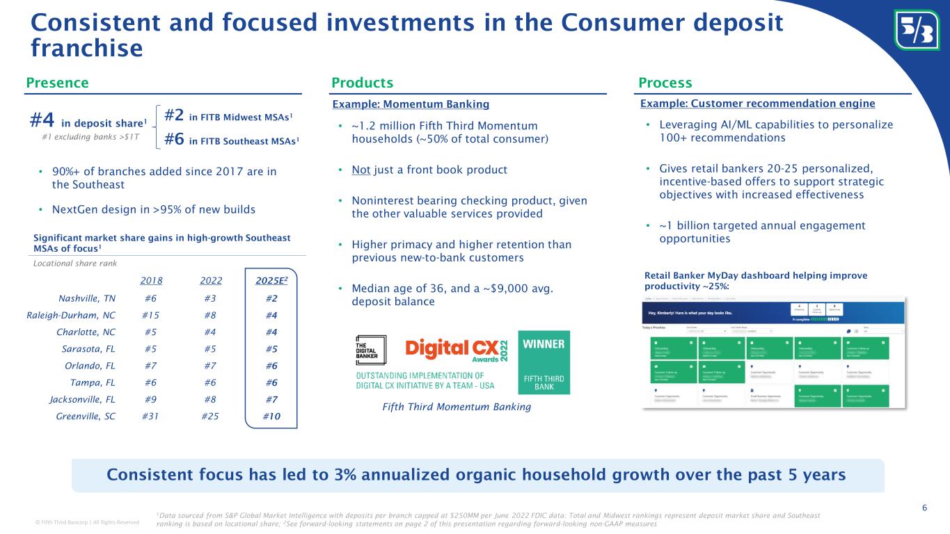 © Fifth Third Bancorp | All Rights Reserved 0.00% 0.10% 0.20% 0.30% 0.40% 0.50% 0.60% 0.00% 0.10% 0.20% 0.30% 0.40% 0.50% 0.60% Our deposit franchise stands out favorably among peers 5 Only bank among peers to increase deposits since 2Q22 Note: Banks impacted by M&A excluded from analysis ACH Credit receive / Consumer Deposits A C H D e b it s e n d / C o m m e r c i a l D e p o s it s 2022 ACH data from NACHA; deposit balances as of 4Q22 High percentage of operating deposit relationships in both commercial and consumer Period-end total deposits; indexed to 100 85 90 95 100 105 2Q22 3Q22 4Q22 1Q23 +1% cumulative increase Fed H.8 (4%) cumulative decrease Peer median (6%) cumulative decrease