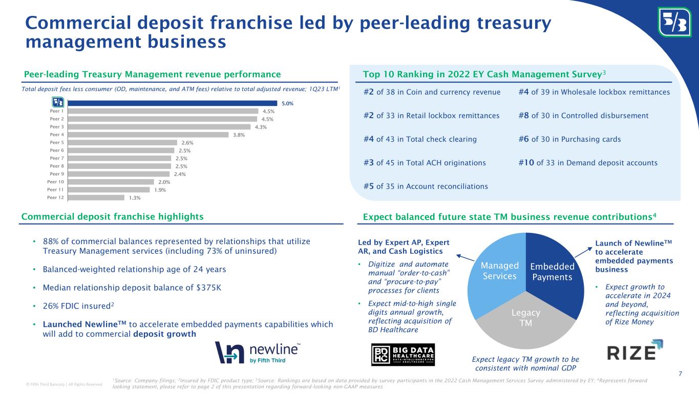 © Fifth Third Bancorp | All Rights Reserved 6 Presence 1 Data sourced from S&P Global Market Intelligence with deposits per branch capped at $250MM per June 2022 FDIC data; Total and Midwest rankings represent deposit market share and Southeast ranking is based on locational share; 2 See forward-looking statements on page 2 of this presentation regarding forward-looking non-GAAP measures Consistent and focused investments in the Consumer deposit franchise Products Consistent focus has led to 3% annualized organic household growth over the past 5 years • 90%+ of branches added since 2017 are in the Southeast • NextGen design in >95% of new builds #2 in FITB Midwest MSAs 1 #6 in FITB Southeast MSAs 1 • ~1.2 million Fifth Third Momentum households (~50% of total consumer) • Not just a front book product • Noninterest bearing checking product, given the other valuable services provided • Higher primacy and higher retention than previous new-to-bank customers • Median age of 36, and a ~$9,000 avg. deposit balance • Leveraging AI/ML capabilities to personalize 100+ recommendations • Gives retail bankers 20-25 personalized, incentive-based offers to support strategic objectives with increased effectiveness • ~1 billion targeted annual engagement opportunities #4 in deposit share 1 Significant market share gains in high-growth Southeast MSAs of focus 1 #1 excluding banks >$1T Fifth Third Momentum Banking Retail Banker MyDay dashboard helping improve productivity ~25%: Example: Momentum Banking Example: Customer recommendation engine Process Locational share rank Sarasota, FL Jacksonville, FL Raleigh-Durham, NC Orlando, FL Greenville, SC Nashville, TN Charlotte, NC Tampa, FL #5 #9 #15 #7 #31 #6 #5 #6 #5 #8 #8 #7 #25 #3 #4 #6 #5 #7 #4 #6 #10 #2 #4 #6 2018 2022 2025E 2