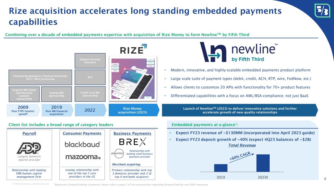 © Fifth Third Bancorp | All Rights Reserved Led by Expert AP, Expert AR, and Cash Logistics • Digitize and automate manual “order-to-cash” and “procure-to-pay” processes for clients • Expect mid-to-high single digits annual growth, reflecting acquisition of BD Healthcare Commercial deposit franchise led by peer-leading treasury management business 7 Commercial deposit franchise highlights 1.3% 1.9% 2.0% 2.4% 2.5% 2.5% 2.5% 2.6% 3.8% 4.3% 4.5% 4.5% 5.0% Peer 12 Peer 11 Peer 10 Peer 9 Peer 8 Peer 7 Peer 6 Peer 5 Peer 4 Peer 3 Peer 2 Peer 1 x Total deposit fees less consumer (OD, maintenance, and ATM fees) relative to total adjusted revenue; 1Q23 LTM 1 1 Source: Company filings; 2 Insured by FDIC product type; 3 Source: Rankings are based on data provided by survey participants in the 2022 Cash Management Services Survey administered by EY; 4 Represents forward looking statement, please refer to page 2 of this presentation regarding forward-looking non-GAAP measures #2 of 38 in Coin and currency revenue #2 of 33 in Retail lockbox remittances #4 of 43 in Total check clearing #3 of 45 in Total ACH originations #5 of 35 in Account reconciliations #4 of 39 in Wholesale lockbox remittances #8 of 30 in Controlled disbursement #6 of 30 in Purchasing cards #10 of 33 in Demand deposit accounts Peer-leading Treasury Management revenue performance Expect balanced future state TM business revenue contributions 4 Legacy TM Managed Services Embedded Payments • 88% of commercial balances represented by relationships that utilize Treasury Management services (including 73% of uninsured) • Balanced-weighted relationship age of 24 years • Median relationship deposit balance of $375K • 26% FDIC insured 2 • Launched Newline TM to accelerate embedded payments capabilities which will add to commercial deposit growth Top 10 Ranking in 2022 EY Cash Management Survey 3 Launch of Newline TM to accelerate embedded payments business • Expect growth to accelerate in 2024 and beyond, reflecting acquisition of Rize Money Expect legacy TM growth to be consistent with nominal GDP