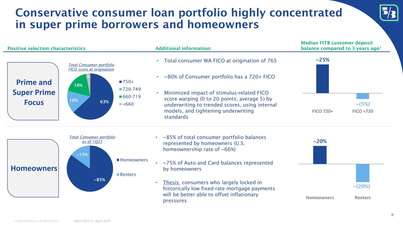 © Fifth Third Bancorp | All Rights Reserved Rize acquisition accelerates long standing embedded payments capabilities 8 Combining over a decade of embedded payments expertise with acquisition of Rize Money to form Newline TM by Fifth Third Client list includes a broad range of category leaders • Expect FY23 revenue of ~$130MM (incorporated into April 2023 guide) • Expect FY23 deposit growth of ~40% (expect 4Q23 balances of ~$2B) Acquirer BIN (bank identification number) sponsorship Issuing BIN sponsorship Credit Card BIN sponsorship Originating depository financial institution ACH / Wire processing Deposit Account Solutions Embedded payments at-a-glance 1 : • Modern, innovative, and highly-scalable embedded payments product platform • Large scale suite of payment types (debit, credit, ACH, RTP, wire, FedNow, etc.) • Allows clients to customize 20 APIs with functionality for 70+ product features • Differentiated capabilities with a focus on AML/BSA compliance; not just BaaS 2009 Post FTPS (Vantiv) spinoff Rize Money acquisition (2023) Launch of Newline TM (2023) to deliver innovative solutions and further accelerate growth of new quality relationships Payroll Consumer Payments Business Payments 1 Represents forward looking statement, please refer to page 2 of this presentation regarding forward-looking non-GAAP measures RTP 2019 Post MB Financial acquisition 2022 2019 2023E Total Revenue Largest domestic payroll provider Issuing relationship with one of the top 3 core providers in the US Primary relationship with top 3 domestic provider and 2 of top 4 non-bank acquirers Merchant acquiring Relationship with leading SMB human capital management firm Relationship with leading small business payment provider