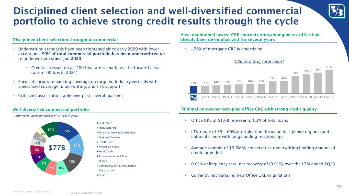 © Fifth Third Bancorp | All Rights Reserved 9 Conservative consumer loan portfolio highly concentrated in super prime borrowers and homeowners 1 April 2023 vs. April 2020 Additional information: ~20% ~(20%) Homeowners Renters ~25% ~(5%) FICO 720+ FICO <720 Median FITB customer deposit balance compared to 3 years ago 1 • ~85% of total consumer portfolio balances represented by homeowners (U.S. homeownership rate of ~66%) • ~75% of Auto and Card balances represented by homeowners • Thesis: consumers who largely locked in historically low fixed-rate mortgage payments will be better able to offset inflationary pressures Homeowners Prime and Super Prime Focus • Total consumer WA FICO at origination of 765 • ~80% of Consumer portfolio has a 720+ FICO • Minimized impact of stimulus-related FICO score warping (0 to 20 points; average 5) by underwriting to trended scores, using internal models, and tightening underwriting standards 63% 16% 18% 3% 750+ 720-749 660-719 <660 Positive selection characteristics Total Consumer portfolio FICO score at origination ~85% ~15% Homeowners Renters Total Consumer portfolio as of 1Q23