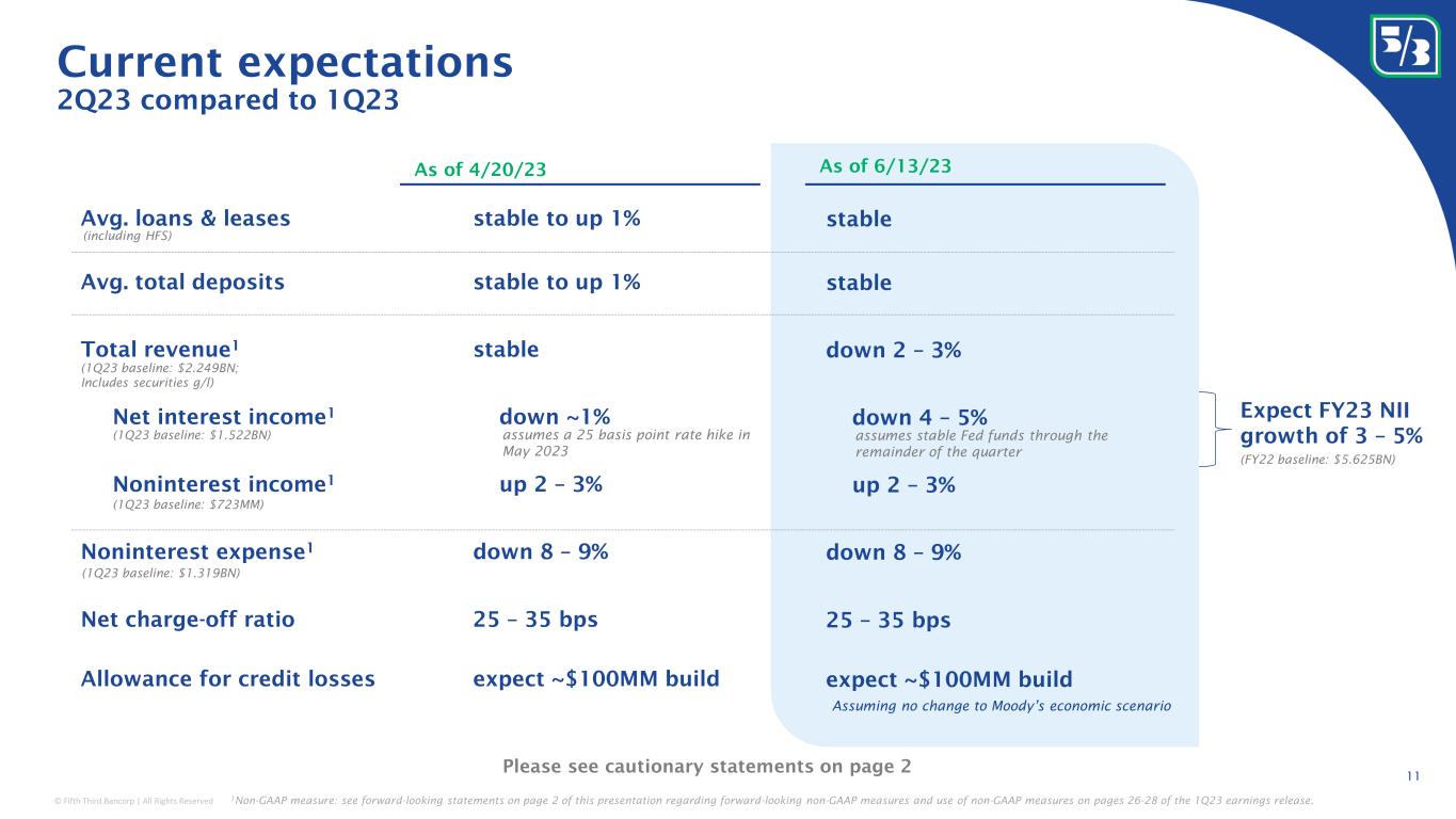 © Fifth Third Bancorp | All Rights Reserved Net interest income 1 Noninterest income 1 up 2 – 3% Noninterest expense 1 down 8 – 9% down ~1% (1Q23 baseline: $1.522BN) (1Q23 baseline: $723MM) (1Q23 baseline: $1.319BN) Net charge-off ratio 25 – 35 bps 1 Non-GAAP measure: see forward-looking statements on page 2 of this presentation regarding forward-looking non-GAAP measures and use of non-GAAP measures on pages 26-28 of the 1Q23 earnings release. Please see cautionary statements on page 2 Total revenue 1 stable (1Q23 baseline: $2.249BN; Includes securities g/l) (including HFS) Avg. loans & leases stable to up 1% Current expectations 2Q23 compared to 1Q23 11 assumes a 25 basis point rate hike in May 2023 Allowance for credit losses expect ~$100MM build As of 4/20/23 As of 6/13/23 up 2 – 3% down 8 – 9% down 4 – 5% 25 – 35 bps down 2 – 3% stable assumes stable Fed funds through the remainder of the quarter expect ~$100MM build Assuming no change to Moody’s economic scenario Avg. total deposits stable to up 1% stable Expect FY23 NII growth of 3 – 5% (FY22 baseline: $5.625BN)