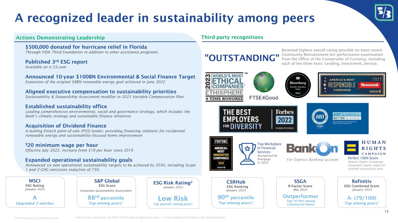 © Fifth Third Bancorp | All Rights Reserved Classification: Internal Use 13 Addressing climate change Promoting inclusion and diversity Demonstrating our commitment to employees Strengthening our communities Keeping the customer at the center $165MM in lending, investments, and philanthropy towards Empowering Black Futures Neighborhood Investment Program 3 $1.4BN provided in community development lending and investment in 2022 ~$39MM in charitable donations to support communities ~118K hours of community service “Outstanding” rating on most recent Community Reinvestment Act performance examination from the Office of the Comptroller of Currency $20/hour minimum wage with over 40% of workforce receiving mid-year compensation increase Up to 7% 401(k) employer contribution with 80% participation ~776K hours of training (40 hours average / FTE) Decrease in overall turnover from 21.2% in 2021, to 21.0% in 2022 New flexible PTO policy including volunteer paid time away for full-time (8 hours) and part-time (4 hours) employees 12MM customer outreach calls, continuing our heightened connection to the customer 3.1% YoY consumer household growth compared to 1Q22 Low reliance on punitive consumer fees, with $13MM in NSF fees eliminated and $39MM in overdraft fees avoided with Extra Time ® $27BN deposited up to 2 days early with Early Pay® $26MM in consumer cash back rewards with 5/3 Cash/Back cards $2.9BN in lending, investments, financial accessibility and philanthropy towards $2.8BN AREEI initiative 1,2 36% board diversity 5 58% women; 28% persons of color in workforce >99% pay equity for women and minorities 8 $120MM Tier 1 diverse supplier spend, 11% of net addressable spend ~1K members in employee Sustainability Business Resource Group as of May 2023 ~$30BN in sustainable financing towards $100BN goal 1 285 due diligence reviews for sensitive sectors in compliance with E&S Risk Management Framework 4 50% reduction in Scope 1 and 2 GHG emissions since 2014 100% renewable energy purchased since 2019 Achieved carbon neutrality in our operations since 2020 6 $500MM inaugural Green Bond issued in October 2021 7 Fifth Third is committed to supporting customers, communities and employees Data is for fiscal year 2022, unless otherwise noted; 1 Data is through 3/31/2023; 2 Three-year $2.8BN commitment to Accelerate Racial Equity, Equality and Inclusion initiative timeframe is from 1/1/21 – 12/31/23; 3 Data is through 4/30/2023; Three-year $180MM Empowering Black Futures Neighborhood Investment Program is from 6/1/21 – 5/31/24; 4 9/23/2020 - 3/31/2022. The Environmental and Social Risk Management Framework (previously Environmental and Social Policy) can be found at ir.53.com/esg/environment; 5 Data is as of 4/18/23, in terms of ethnicity or gender; 6 For Scope 1, Scope 2 and business travel under Scope 3 emissions. Final CO2e emissions will be made available in 2023 following independent verification; 7 Sustainable Bond Report can be found at ir.53.com/esg/Sustainable-Bonds; 8 Refer to the 2021 ESG report for additional details on methodology. Sustainability priorities and metrics