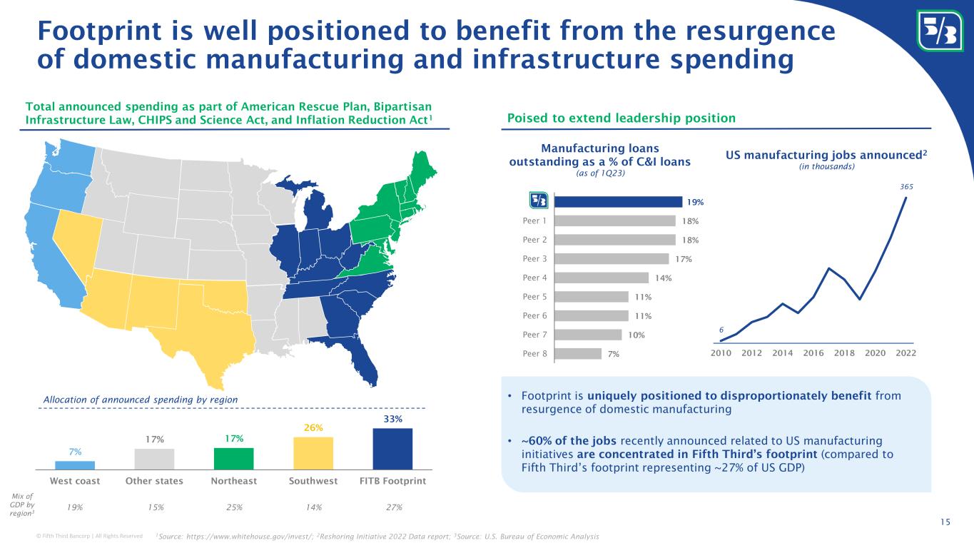 © Fifth Third Bancorp | All Rights Reserved Classification: Internal Use 14 Actions Demonstrating Leadership Third-party recognitions $500,000 donated for hurricane relief in Florida Through Fifth Third Foundation in addition to other assistance programs Published 3 rd ESG report Available on ir.53.com Announced 10-year $100BN Environmental & Social Finance Target Expansion of the original $8BN renewable energy goal achieved in June 2022 Aligned executive compensation to sustainability priorities Sustainability & Stewardship Assessment modifier in 2023 Variable Compensation Plan Established sustainability office Leading comprehensive environmental, social and governance strategy, which includes the Bank’s climate strategy and sustainable finance initiatives Acquisition of Dividend Finance A leading fintech point-of-sale (POS) lender, providing financing solutions for residential renewable energy and sustainability-focused home improvement $ 20 minimum wage per hour Effective July 2022, increase from $18 per hour since 2019 Expanded operational sustainability goals Announced six new operational sustainability targets to be achieved by 2030, including Scope 1 and 2 GHG emissions reduction of 75% SSGA R-Factor Score May 2023 Outperformer Top 10-30% among Commercial Banks S&P Global ESG Score 88 rd percentile Top among peers 1 MSCI ESG Rating January 2023 A Upgraded 3 notches CSRHub ESG Ranking January 2023 90 th percentile Top among peers 1 ESG Risk Rating 2 January 2023 Low Risk Top quartile among peers 1 Refinitiv ESG Combined Score January 2023 A- (79/100) Top among peers 1 A recognized leader in sustainability among peers 1 Peer Group comprises of Fifth Third's board approved peers; 2 From leading third party ESG data provider. Top Workplace In Financial Services Recognized by Energage in 2022 Perfect 100% Score Human Rights Campaign Corporate Equity index for seventh consecutive year For Express Banking account Corporate Sustainability Assessment "OUTSTANDING" Received highest overall rating possible on most recent Community Reinvestment Act performance examination from the Office of the Comptroller of Currency, including each of the three tests: Lending, Investment, Service.