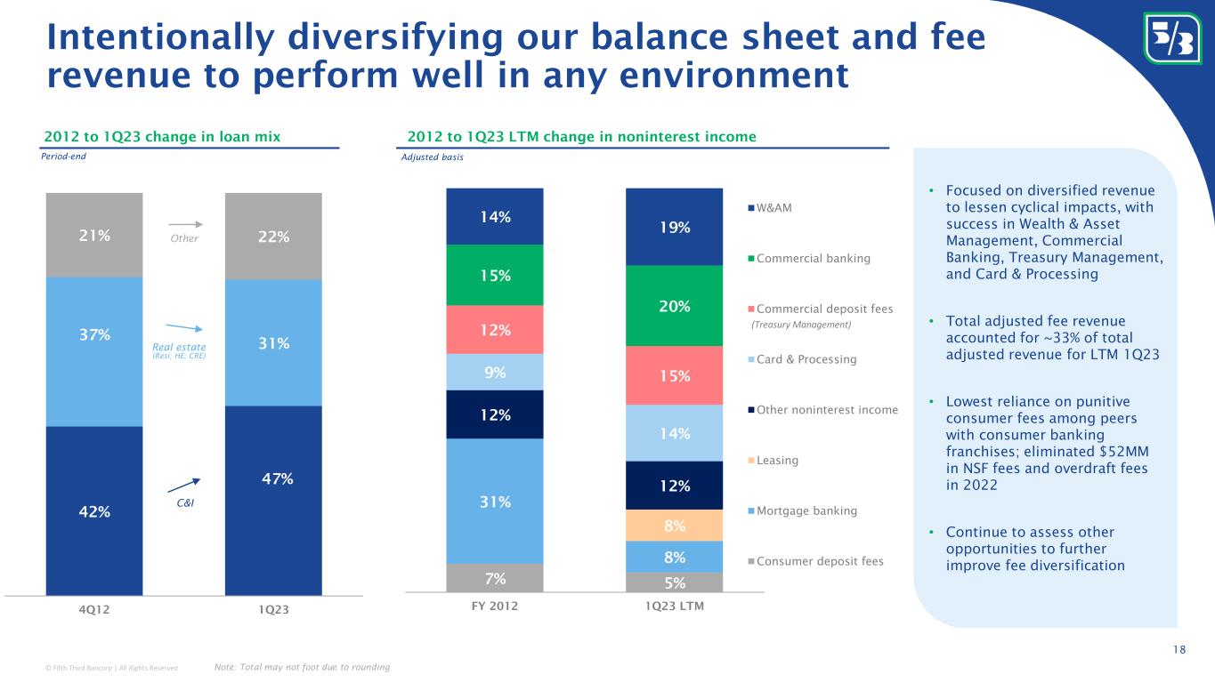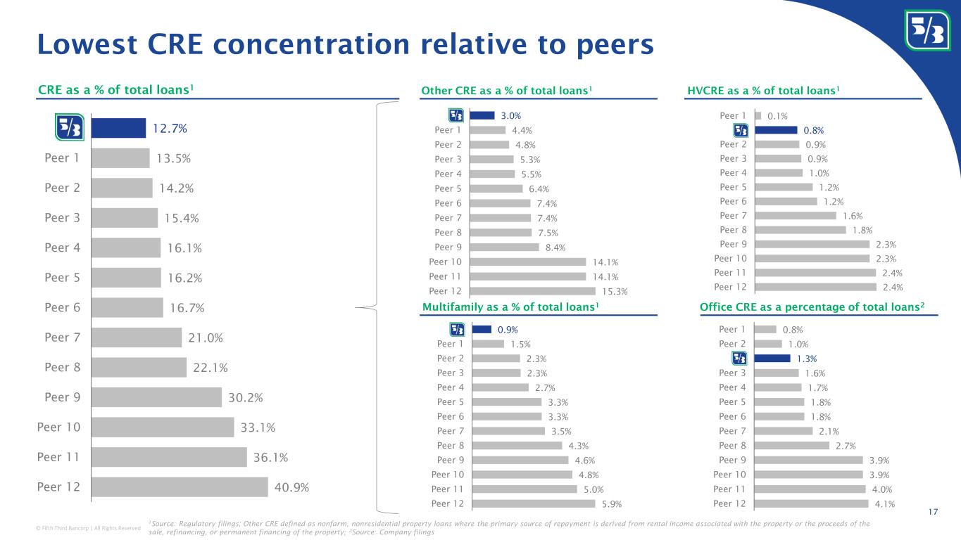 © Fifth Third Bancorp | All Rights Reserved 15.3% 14.1% 14.1% 8.4% 7.5% 7.4% 7.4% 6.4% 5.5% 5.3% 4.8% 4.4% 3.0% Peer 12 Peer 11 Peer 10 Peer 9 Peer 8 Peer 7 Peer 6 Peer 5 Peer 4 Peer 3 Peer 2 Peer 1 x 2.4% 2.4% 2.3% 2.3% 1.8% 1.6% 1.2% 1.2% 1.0% 0.9% 0.9% 0.8% 0.1% Peer 12 Peer 11 Peer 10 Peer 9 Peer 8 Peer 7 Peer 6 Peer 5 Peer 4 Peer 3 Peer 2 x Peer 1 5.9% 5.0% 4.8% 4.6% 4.3% 3.5% 3.3% 3.3% 2.7% 2.3% 2.3% 1.5% 0.9% Peer 12 Peer 11 Peer 10 Peer 9 Peer 8 Peer 7 Peer 6 Peer 5 Peer 4 Peer 3 Peer 2 Peer 1 x 4.1% 4.0% 3.9% 3.9% 2.7% 2.1% 1.8% 1.8% 1.7% 1.6% 1.3% 1.0% 0.8% Peer 12 Peer 11 Peer 10 Peer 9 Peer 8 Peer 7 Peer 6 Peer 5 Peer 4 Peer 3 x Peer 2 Peer 1 Lowest CRE concentration relative to peers 40.9% 36.1% 33.1% 30.2% 22.1% 21.0% 16.7% 16.2% 16.1% 15.4% 14.2% 13.5% 12.7% Peer 12 Peer 11 Peer 10 Peer 9 Peer 8 Peer 7 Peer 6 Peer 5 Peer 4 Peer 3 Peer 2 Peer 1 FITB CRE as a % of total loans 1 HVCRE as a % of total loans 1 Multifamily as a % of total loans 1 Office CRE as a percentage of total loans 2 1 Source: Regulatory filings; Other CRE defined as nonfarm, nonresidential property loans where the primary source of repayment is derived from rental income associated with the property or the proceeds of the sale, refinancing, or permanent financing of the property; 2 Source: Company filings Other CRE as a % of total loans 1 17