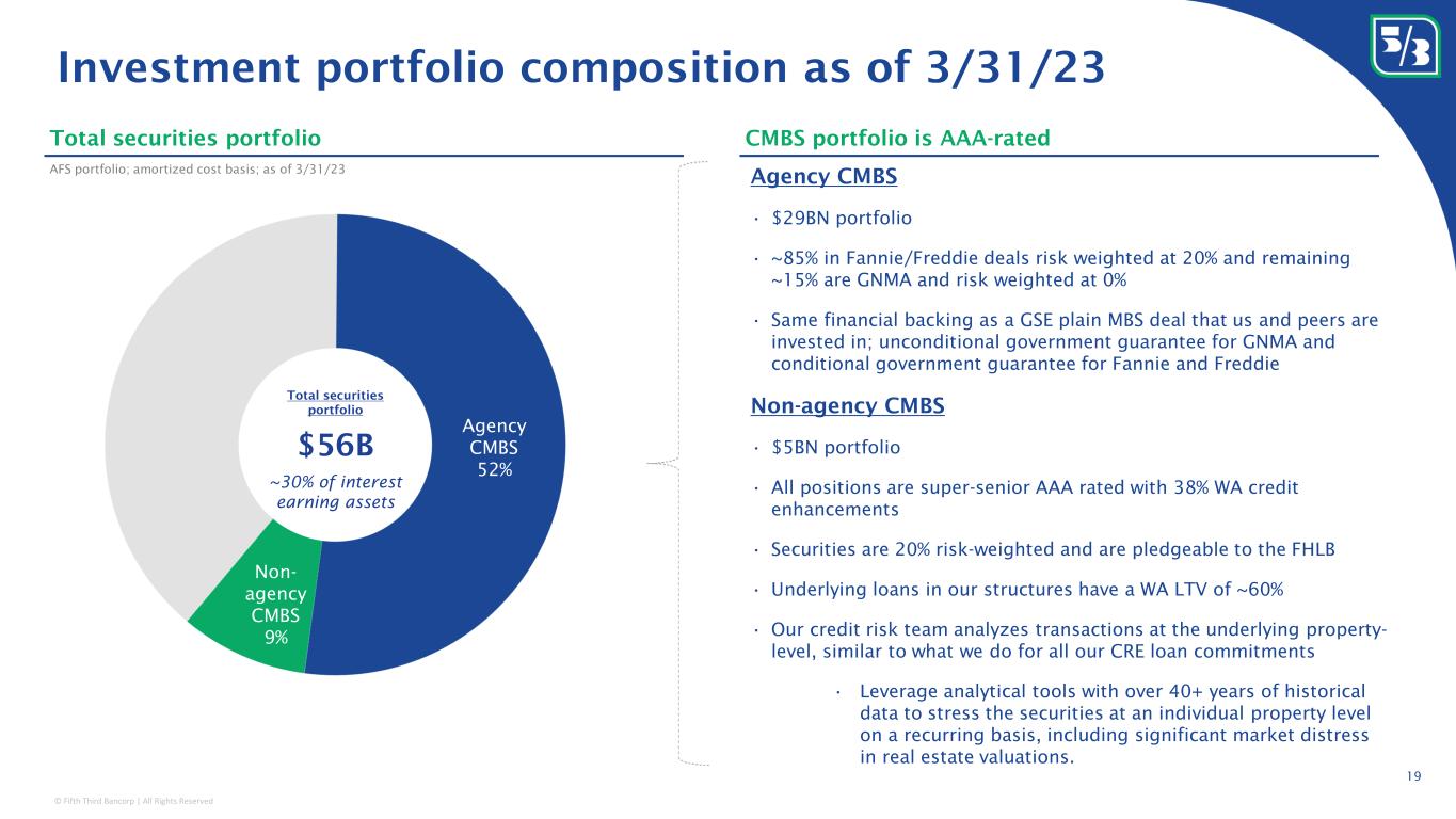 © Fifth Third Bancorp | All Rights Reserved 7% 5% 31% 8% 8% 12% 12% 9% 14% 12% 15% 15% 20% 14% 19% FY 2012 1Q23 LTM W&AM Commercial banking Commercial deposit fees Card & Processing Other noninterest income Leasing Mortgage banking Consumer deposit fees 42% 47% 37% 31% 21% 22% 4Q12 1Q23 C&I Real estate (Resi; HE; CRE) Other Intentionally diversifying our balance sheet and fee revenue to perform well in any environment • Focused on diversified revenue to lessen cyclical impacts, with success in Wealth & Asset Management, Commercial Banking, Treasury Management, and Card & Processing • Total adjusted fee revenue accounted for ~33% of total adjusted revenue for LTM 1Q23 • Lowest reliance on punitive consumer fees among peers with consumer banking franchises; eliminated $52MM in NSF fees and overdraft fees in 2022 • Continue to assess other opportunities to further improve fee diversification (Treasury Management) 2012 to 1Q23 change in loan mix 2012 to 1Q23 LTM change in noninterest income Adjusted basisPeriod-end 18 Note: Total may not foot due to rounding