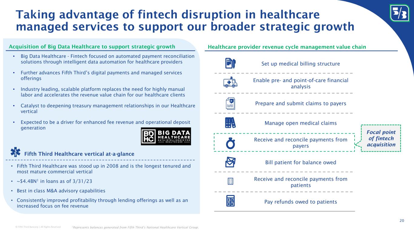 © Fifth Third Bancorp | All Rights Reserved Taking advantage of fintech disruption in healthcare managed services to support our broader strategic growth Healthcare provider revenue cycle management value chain Set up medical billing structure Enable pre- and point-of-care financial analysis Prepare and submit claims to payers Manage open medical claims Receive and reconcile payments from payers Bill patient for balance owed Receive and reconcile payments from patients Pay refunds owed to patients Focal point of fintech acquisition Acquisition of Big Data Healthcare to support strategic growth • Big Data Healthcare - Fintech focused on automated payment reconciliation solutions through intelligent data automation for healthcare providers • Further advances Fifth Third’s digital payments and managed services offerings • Industry leading, scalable platform replaces the need for highly manual labor and accelerates the revenue value chain for our healthcare clients • Catalyst to deepening treasury management relationships in our Healthcare vertical • Expected to be a driver for enhanced fee revenue and operational deposit generation Fifth Third Healthcare vertical at-a-glance • Fifth Third Healthcare was stood up in 2008 and is the longest tenured and most mature commercial vertical • ~$4.4BN 1 in loans as of 3/31/23 • Best in class M&A advisory capabilities • Consistently improved profitability through lending offerings as well as an increased focus on fee revenue 1 Represents balances generated from Fifth Third’s National Healthcare Vertical Group. 20