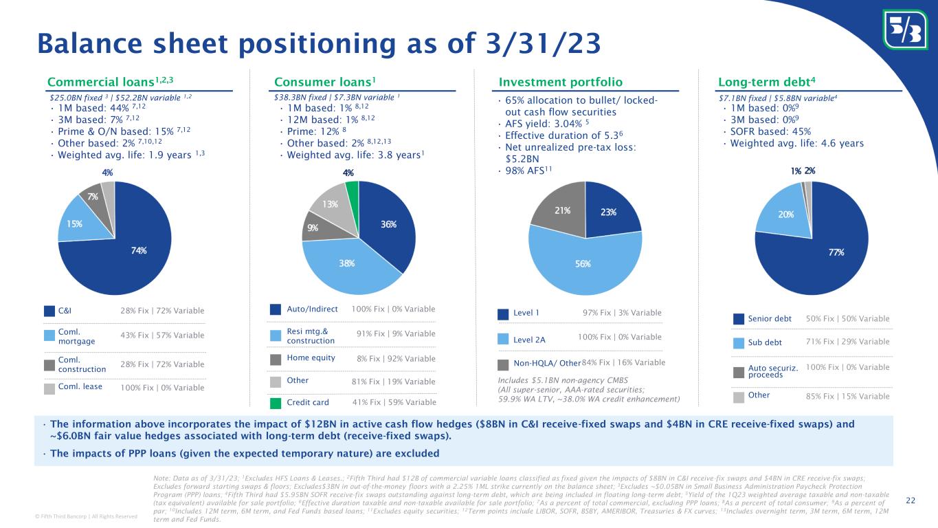 © Fifth Third Bancorp | All Rights Reserved ($3BN @ 2.25% 1- month LIBOR strike) Cash flow hedges continue to protect NIM 1 EOP notional value of cash flow hedges ($ in billions) Actual Cash flow hedges 1 Represents forward looking statement, please refer to page 2 of this presentation regarding forward-looking non-GAAP measures; All swaps are receive fixed / pay 1-month LIBOR.; 2 $3BN floors mature on 12/16/2024. Swap protection extends through 2031 ~$125MM uplift starting in 2025 regardless of rate environment 21 Floors Forward starting swaps Existing swaps weighted average receive fix rate (swaps only) 2.37% 2.37% 2.37% 3.32%2.34% 2.34%2.34% 2.35% 2.50% 3.17% 3.19% 3.27% 3.29% 3.44% 2