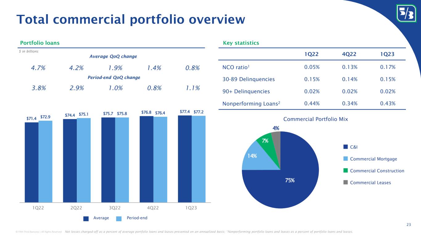 © Fifth Third Bancorp | All Rights Reserved • 65% allocation to bullet/ locked- out cash flow securities • AFS yield: 3.04% 5 • Effective duration of 5.3 6 • Net unrealized pre-tax loss: $5.2BN • 98% AFS 11 $25.0BN fixed 3 | $52.2BN variable 1,2 Commercial loans 1,2,3 Balance sheet positioning as of 3/31/23 100% Fix | 0% Variable 84% Fix | 16% Variable Investment portfolioConsumer loans 1 Long-term debt 4 $38.3BN fixed | $7.3BN variable 1 $7.1BN fixed | $5.8BN variable 4 • 1M based: 44% 7,12 • 3M based: 7% 7,12 • Prime & O/N based: 15% 7,12 • Other based: 2% 7,10,12 • Weighted avg. life: 1.9 years 1,3 • 1M based: 1% 8,12 • 12M based: 1% 8,12 • Prime: 12% 8 • Other based: 2% 8,12,13 • Weighted avg. life: 3.8 years 1 • 1M based: 0% 9 • 3M based: 0% 9 • SOFR based: 45% • Weighted avg. life: 4.6 years C&I 28% Fix | 72% Variable Coml. mortgage 43% Fix | 57% Variable Coml. lease 100% Fix | 0% Variable Resi mtg.& construction 91% Fix | 9% Variable Home equity 8% Fix | 92% Variable Senior debt 50% Fix | 50% Variable Sub debt 71% Fix | 29% Variable Auto securiz. proceeds 100% Fix | 0% Variable Coml. construction 28% Fix | 72% Variable Credit card 41% Fix | 59% Variable Other 81% Fix | 19% Variable Other 85% Fix | 15% Variable Level 1 97% Fix | 3% Variable Level 2A Non-HQLA/ Other • The information above incorporates the impact of $12BN in active cash flow hedges ($8BN in C&I receive-fixed swaps and $4BN in CRE receive-fixed swaps) and ~$6.0BN fair value hedges associated with long-term debt (receive-fixed swaps). • The impacts of PPP loans (given the expected temporary nature) are excluded Includes $5.1BN non-agency CMBS (All super-senior, AAA-rated securities; 59.9% WA LTV, ~38.0% WA credit enhancement) Auto/Indirect 100% Fix | 0% Variable Note: Data as of 3/31/23; 1 Excludes HFS Loans & Leases.; 2 Fifth Third had $12B of commercial variable loans classified as fixed given the impacts of $8BN in C&I receive-fix swaps and $4BN in CRE receive-fix swaps; Excludes forward starting swaps & floors; Excludes$3BN in out-of-the-money floors with a 2.25% 1ML strike currently on the balance sheet; 3 Excludes ~$0.05BN in Small Business Administration Paycheck Protection Program (PPP) loans; 4 Fifth Third had $5.95BN SOFR receive-fix swaps outstanding against long-term debt, which are being included in floating long-term debt; 5 Yield of the 1Q23 weighted average taxable and non-taxable (tax equivalent) available for sale portfolio; 6 Effective duration taxable and non-taxable available for sale portfolio; 7 As a percent of total commercial, excluding PPP loans; 8 As a percent of total consumer; 9 As a percent of par; 10 Includes 12M term, 6M term, and Fed Funds based loans; 11 Excludes equity securities; 12 Term points include LIBOR, SOFR, BSBY, AMERIBOR, Treasuries & FX curves; 13 Includes overnight term, 3M term, 6M term, 12M term and Fed Funds. 22