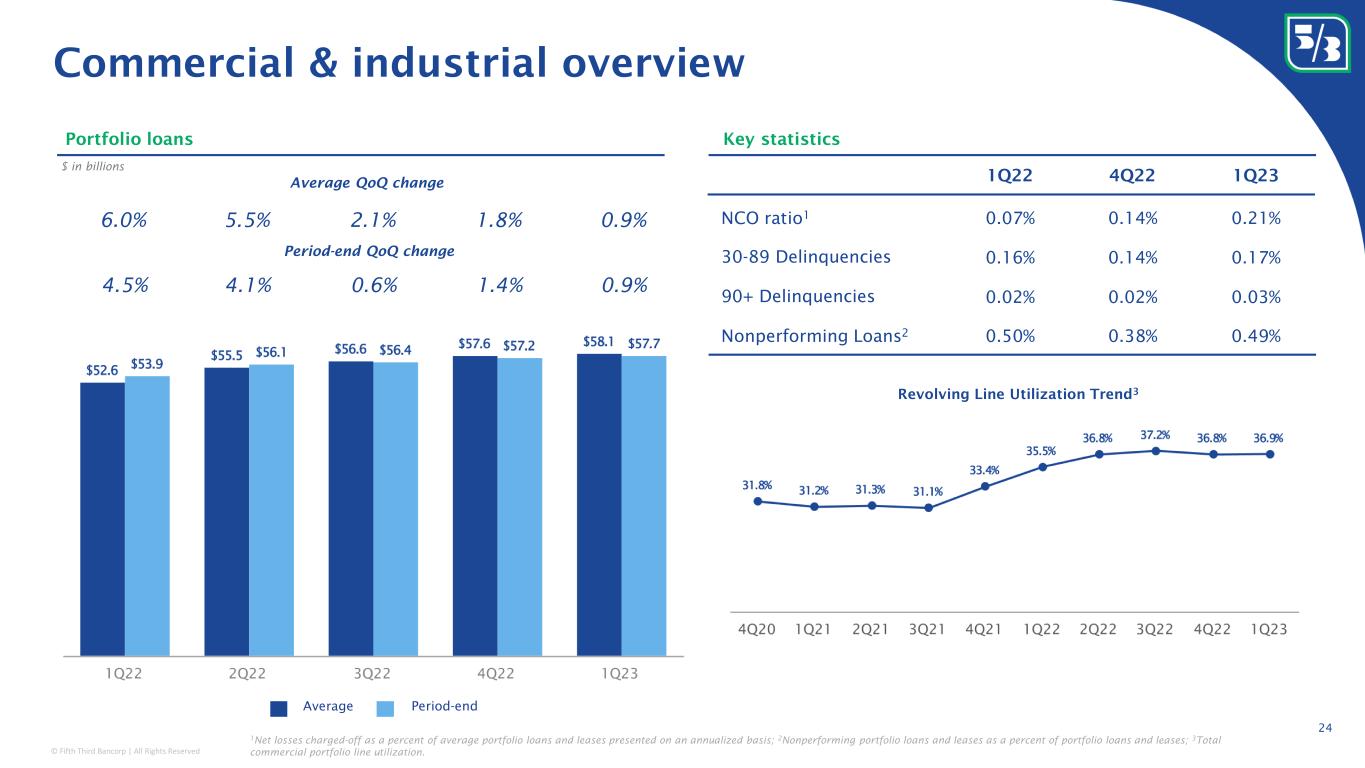 © Fifth Third Bancorp | All Rights Reserved Classification: Internal Use 1Q22 4Q22 1Q23 NCO ratio 1 0.05% 0.13% 0.17% 30-89 Delinquencies 0.15% 0.14% 0.15% 90+ Delinquencies 0.02% 0.02% 0.02% Nonperforming Loans 2 0.44% 0.34% 0.43% 23 Portfolio loans $ in billions Period-end QoQ change Average QoQ change Key statistics Total commercial portfolio overview Net losses charged-off as a percent of average portfolio loans and leases presented on an annualized basis; 1 Nonperforming portfolio loans and leases as a percent of portfolio loans and leases. 4.7% 4.2% 1.9% 1.4% 0.8% 3.8% 2.9% 1.0% 0.8% 1.1% Period-endAverage