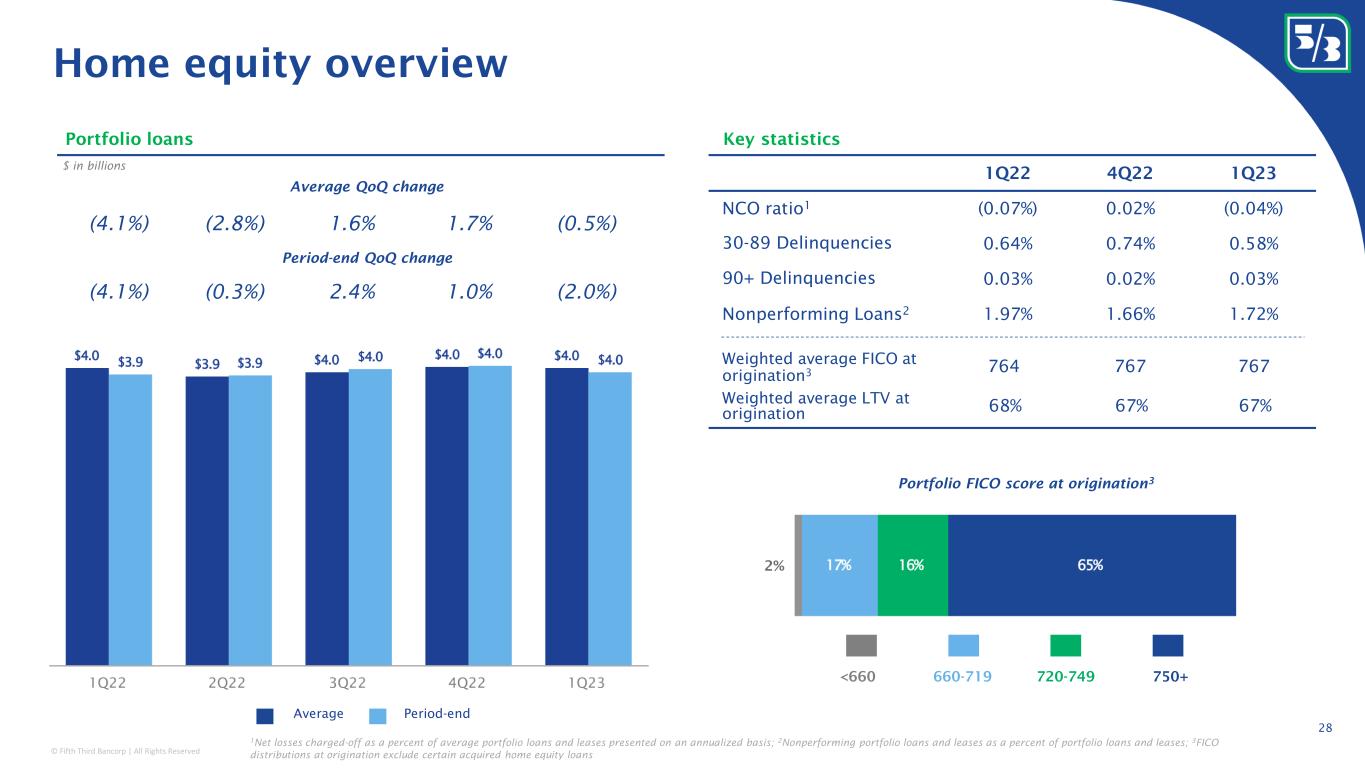 © Fifth Third Bancorp | All Rights Reserved Classification: Internal Use 1Q22 4Q22 1Q23 NCO ratio 1 (0.02%) 0.01% 0.00% 30-89 Delinquencies 0.09% 0.17% 0.10% 90+ Delinquencies 0.08% 0.04% 0.05% Nonperforming Loans 2 0.51% 0.70% 0.73% Weighted average FICO at origination 3 767 765 764 Weighted average LTV at origination 70% 71% 71% Residential Mortgage overview 27 Portfolio FICO score at origination 3 $ in billions Portfolio loans Key statistics Period-end QoQ change Average QoQ change 1.9% 5.2% 1.5% (0.2%) — 4.6% 2.5% 0.2% 0.2% (0.1%) 750+720-749<660 660-719 4% Period-endAverage 1 Net losses charged-off as a percent of average portfolio loans and leases presented on an annualized basis; 2 Nonperforming portfolio loans and leases as a percent of portfolio loans and leases; 3 FICO distributions at origination exclude certain acquired mortgage loans