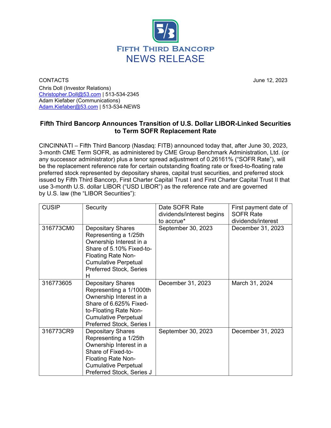 NEWS RELEASE CONTACTS June 12, 2023 Chris Doll (Investor Relations) Christopher.Doll@53.com | 513-534-2345 Adam Kiefaber (Communications) Adam.Kiefaber@53.com | 513-534-NEWS Fifth Third Bancorp Announces Transition of U.S. Dollar LIBOR-Linked Securities to Term SOFR Replacement Rate CINCINNATI – Fifth Third Bancorp (Nasdaq: FITB) announced today that, after June 30, 2023, 3-month CME Term SOFR, as administered by CME Group Benchmark Administration, Ltd. (or any successor administrator) plus a tenor spread adjustment of 0.26161% (“SOFR Rate”), will be the replacement reference rate for certain outstanding floating rate or fixed-to-floating rate preferred stock represented by depositary shares, capital trust securities, and preferred stock issued by Fifth Third Bancorp, First Charter Capital Trust I and First Charter Capital Trust II that use 3-month U.S. dollar LIBOR (“USD LIBOR”) as the reference rate and are governed by U.S. law (the “LIBOR Securities”): CUSIP Security Date SOFR Rate dividends/interest begins to accrue* First payment date of SOFR Rate dividends/interest 316773CM0 Depositary Shares Representing a 1/25th Ownership Interest in a Share of 5.10% Fixed-to- Floating Rate Non- Cumulative Perpetual Preferred Stock, Series H September 30, 2023 December 31, 2023 316773605 Depositary Shares Representing a 1/1000th Ownership Interest in a Share of 6.625% Fixed- to-Floating Rate Non- Cumulative Perpetual Preferred Stock, Series I December 31, 2023 March 31, 2024 316773CR9 Depositary Shares Representing a 1/25th Ownership Interest in a Share of Fixed-to- Floating Rate Non- Cumulative Perpetual Preferred Stock, Series J September 30, 2023 December 31, 2023