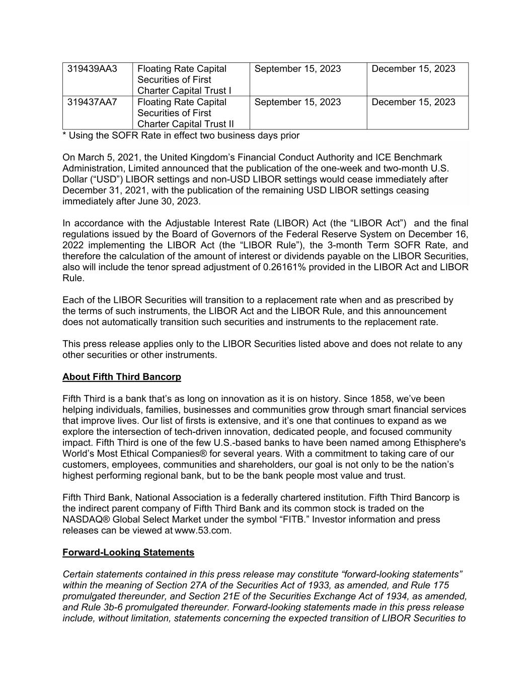 319439AA3 Floating Rate Capital Securities of First Charter Capital Trust I September 15, 2023 December 15, 2023 319437AA7 Floating Rate Capital Securities of First Charter Capital Trust II September 15, 2023 December 15, 2023 * Using the SOFR Rate in effect two business days prior On March 5, 2021, the United Kingdom’s Financial Conduct Authority and ICE Benchmark Administration, Limited announced that the publication of the one-week and two-month U.S. Dollar (“USD”) LIBOR settings and non-USD LIBOR settings would cease immediately after December 31, 2021, with the publication of the remaining USD LIBOR settings ceasing immediately after June 30, 2023. In accordance with the Adjustable Interest Rate (LIBOR) Act (the “LIBOR Act”) and the final regulations issued by the Board of Governors of the Federal Reserve System on December 16, 2022 implementing the LIBOR Act (the “LIBOR Rule”), the 3-month Term SOFR Rate, and therefore the calculation of the amount of interest or dividends payable on the LIBOR Securities, also will include the tenor spread adjustment of 0.26161% provided in the LIBOR Act and LIBOR Rule. Each of the LIBOR Securities will transition to a replacement rate when and as prescribed by the terms of such instruments, the LIBOR Act and the LIBOR Rule, and this announcement does not automatically transition such securities and instruments to the replacement rate. This press release applies only to the LIBOR Securities listed above and does not relate to any other securities or other instruments. About Fifth Third Bancorp Fifth Third is a bank that’s as long on innovation as it is on history. Since 1858, we’ve been helping individuals, families, businesses and communities grow through smart financial services that improve lives. Our list of firsts is extensive, and it’s one that continues to expand as we explore the intersection of tech-driven innovation, dedicated people, and focused community impact. Fifth Third is one of the few U.S.-based banks to have been named among Ethisphere's World’s Most Ethical Companies® for several years. With a commitment to taking care of our customers, employees, communities and shareholders, our goal is not only to be the nation’s highest performing regional bank, but to be the bank people most value and trust. Fifth Third Bank, National Association is a federally chartered institution. Fifth Third Bancorp is the indirect parent company of Fifth Third Bank and its common stock is traded on the NASDAQ® Global Select Market under the symbol “FITB.” Investor information and press releases can be viewed at www.53.com. Forward-Looking Statements Certain statements contained in this press release may constitute “forward-looking statements” within the meaning of Section 27A of the Securities Act of 1933, as amended, and Rule 175 promulgated thereunder, and Section 21E of the Securities Exchange Act of 1934, as amended, and Rule 3b-6 promulgated thereunder. Forward-looking statements made in this press release include, without limitation, statements concerning the expected transition of LIBOR Securities to