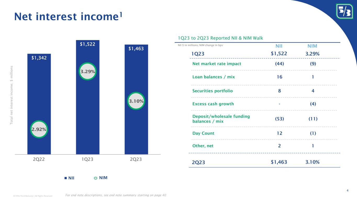© Fifth Third Bancorp | All Rights Reserved Excess cash growth NII $ in millions; NIM change in bps 1Q23 to 2Q23 Reported NII & NIM Walk T o t a l n e t in t e r e s t i n c o m e ; $ m il li o n s NII NIM For end note descriptions, see end note summary starting on page 40 NII $1,5221Q23 3.29% NIM $1,463 3.10%2Q23 Securities portfolio Loan balances / mix 8 4 16 1 (44) (9)Net market rate impact Deposit/wholesale funding balances / mix (53) (11) Net interest income 1 Day Count 12 4 Other, net (1)12 - (4)