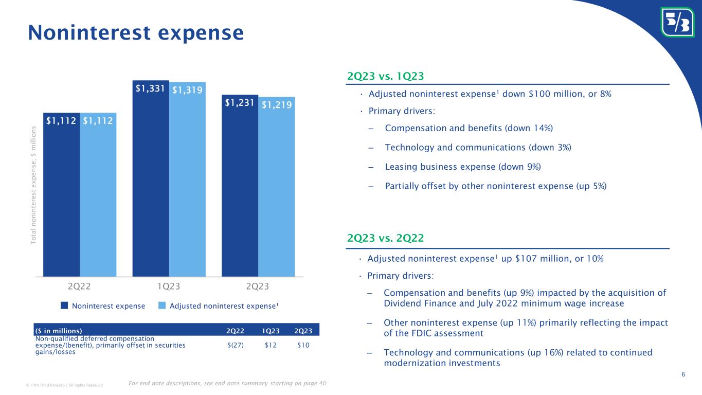 © Fifth Third Bancorp | All Rights Reserved Noninterest income • Adjusted noninterest income 1 up $26 million, or 4% • Primary drivers: ‒ Other noninterest income (up 236%) attributable to equity fund and direct investment income ‒ Service charges on deposits (up 5%) reflecting an increase in both consumer and commercial deposit fees ‒ Partially offset by commercial banking revenue (down 9%) primarily reflecting lower loan syndication revenue and M&A advisory revenue • Adjusted noninterest income 1 up $17 million, or 2% • Primary drivers: ‒ Mortgage banking net revenue (up 90%) reflecting an increase from MSR net valuation adjustments and a decrease in MSR asset decay ‒ Commercial banking revenue (up 7%) reflecting increased loan syndication revenue and client financial risk management revenue ‒ Partially offset by service charges on deposits (down 6%) reflecting the market related impact of higher earnings credits and the elimination of consumer non-sufficient funds fees in July 2022 2Q23 vs. 2Q22 2Q23 vs. 1Q23 For end note descriptions, see end note summary starting on page 40 T o t a l n o n in t e r e s t i n c o m e ; $ m il li o n s Securities losses/(gains), net ($ in millions) 2Q22 1Q23 2Q23 Net loss attributable to legacy venture equity investments $3 $7 $2 Net losses/(gains) attributable to non-qualified deferred compensation plans (NQDC), primarily offset in expenses 26 (10) (8) Other losses/(gains), net 3 (1) (1) Securities losses/(gains), net $32 ($4) ($7) 5