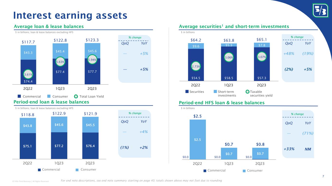 © Fifth Third Bancorp | All Rights Reserved • Adjusted noninterest expense 1 down $100 million, or 8% • Primary drivers: ‒ Compensation and benefits (down 14%) ‒ Technology and communications (down 3%) ‒ Leasing business expense (down 9%) ‒ Partially offset by other noninterest expense (up 5%) T o t a l n o n in t e r e s t e x p e n s e ; $ m il li o n s • Adjusted noninterest expense 1 up $107 million, or 10% • Primary drivers: ‒ Compensation and benefits (up 9%) impacted by the acquisition of Dividend Finance and July 2022 minimum wage increase ‒ Other noninterest expense (up 11%) primarily reflecting the impact of the FDIC assessment ‒ Technology and communications (up 16%) related to continued modernization investments 2Q23 vs. 2Q22 2Q23 vs. 1Q23 For end note descriptions, see end note summary starting on page 40 Noninterest expense 6 ($ in millions) 2Q22 1Q23 2Q23 Non-qualified deferred compensation expense/(benefit), primarily offset in securities gains/losses $(27) $12 $10