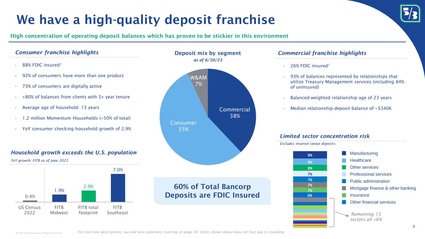 © Fifth Third Bancorp | All Rights Reserved This presentation contains statements that we believe are “forward-looking statements” within the meaning of Section 27A of the Securities Act of 1933, as amended, and Rule 175 promulgated thereunder, and Section 21E of the Securities Exchange Act of 1934, as amended, and Rule 3b-6 promulgated thereunder. All statements other than statements of historical fact are forward-looking statements. These statements relate to our financial condition, results of operations, plans, objectives, future performance, capital actions or business. They usually can be identified by the use of forward-looking language such as “will likely result,” “may,” “are expected to,” “is anticipated,” “potential,” “estimate,” “forecast,” “projected,” “intends to,” or may include other similar words or phrases such as “believes,” “plans,” “trend,” “objective,” “continue,” “remain,” or similar expressions, or future or conditional verbs such as “will,” “would,” “should,” “could,” “might,” “can,” or similar verbs. You should not place undue reliance on these statements, as they are subject to risks and uncertainties, including but not limited to the risk factors set forth in our most recent Annual Report on Form 10-K as updated by our filings with the U.S. Securities and Exchange Commission (“SEC”). There are a number of important factors that could cause future results to differ materially from historical performance and these forward-looking statements. Factors that might cause such a difference include, but are not limited to: (1) effects of the global COVID-19 pandemic; (2) deteriorating credit quality; (3) loan concentration by location or industry of borrowers or collateral; (4) problems encountered by other financial institutions; (5) inadequate sources of funding or liquidity; (6) unfavorable actions of rating agencies; (7) inability to maintain or grow deposits; (8) limitations on the ability to receive dividends from subsidiaries; (9) cyber-security risks; (10) Fifth Third’s ability to secure confidential information and deliver products and services through the use of computer systems and telecommunications networks; (11) failures by third-party service providers; (12) inability to manage strategic initiatives and/or organizational changes; (13) inability to implement technology system enhancements; (14) failure of internal controls and other risk management systems; (15) losses related to fraud, theft, misappropriation or violence; (16) inability to attract and retain skilled personnel; (17) adverse impacts of government regulation; (18) governmental or regulatory changes or other actions; (19) failures to meet applicable capital requirements; (20) regulatory objections to Fifth Third’s capital plan; (21) regulation of Fifth Third’s derivatives activities; (22) deposit insurance premiums; (23) assessments for the orderly liquidation fund; (24) replacement of LIBOR; (25) weakness in the national or local economies; (26) global political and economic uncertainty or negative actions; (27) changes in interest rates and the effects of inflation; (28) changes and trends in capital markets; (29) fluctuation of Fifth Third’s stock price; (30) volatility in mortgage banking revenue; (31) litigation, investigations, and enforcement proceedings by governmental authorities; (32) breaches of contractual covenants, representations and warranties; (33) competition and changes in the financial services industry; (34) changing retail distribution strategies, customer preferences and behavior; (35) difficulties in identifying, acquiring or integrating suitable strategic partnerships, investments or acquisitions; (36) potential dilution from future acquisitions; (37) loss of income and/or difficulties encountered in the sale and separation of businesses, investments or other assets; (38) results of investments or acquired entities; (39) changes in accounting standards or interpretation or declines in the value of Fifth Third’s goodwill or other intangible assets; (40) inaccuracies or other failures from the use of models; (41) effects of critical accounting policies and judgments or the use of inaccurate estimates; (42) weather-related events, other natural disasters, or health emergencies (including pandemics); (43) the impact of reputational risk created by these or other developments on such matters as business generation and retention, funding and liquidity; (44) changes in law or requirements imposed by Fifth Third’s regulators impacting our capital actions, including dividend payments and stock repurchases; and (45) Fifth Third's ability to meet its environmental and/or social targets, goals and commitments. You should refer to our periodic and current reports filed with the Securities and Exchange Commission, or “SEC,” for further information on other factors, which could cause actual results to be significantly different from those expressed or implied by these forward-looking statements. Moreover, you should treat these statements as speaking only as of the date they are made and based only on information then actually known to us. We expressly disclaim any obligation or undertaking to release publicly any updates or revisions to any forward-looking statements contained herein to reflect any change in our expectations or any changes in events, conditions or circumstances on which any such statement is based, except as may be required by law, and we claim the protection of the safe harbor for forward-looking statements contained in the Private Securities Litigation Reform Act of 1995. The information contained herein is intended to be reviewed in its totality, and any stipulations, conditions or provisos that apply to a given piece of information in one part of this press release should be read as applying mutatis mutandis to every other instance of such information a