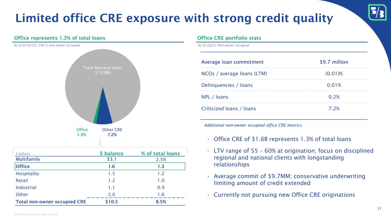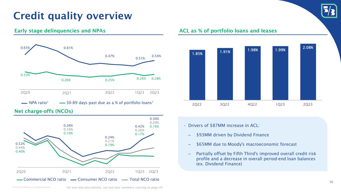 © Fifth Third Bancorp | All Rights Reserved 2Q22 1Q23 2Q23 NCO ratio 1 0.07% 0.04% 0.00% 30-89 Delinquencies 0.07% 0.04% 0.17% 90+ Delinquencies 0.00% 0.00% 0.12% Nonperforming Loans 2 0.30% 0.29% 0.13% Commercial real estate overview CRE Mortgage Balance by occupancy CRE Construction Balance by property type Portfolio loans Key statistics Period-end QoQ change Average QoQ change For end note descriptions, see end note summary starting on page 40; totals shown above may not foot due to rounding $ in billions (0.1%) 2.6% (0.4%) 2.0% 0.1% 1.1% 1.5% 0.8% 1.1% 1.7% Multifamily Other Retail Hospitality Office Industrial Home Builder Non-Owner Occupied Owner Occupied Multifamily 20% Office 20% Hospitality 19% Retail 18% Industrial 6% Other 17% Non-owner occupied property type mix 30