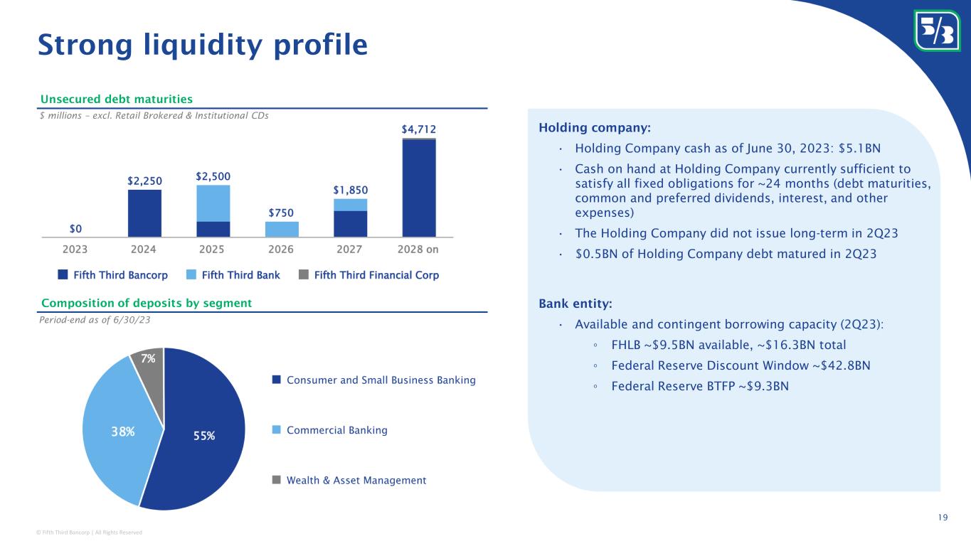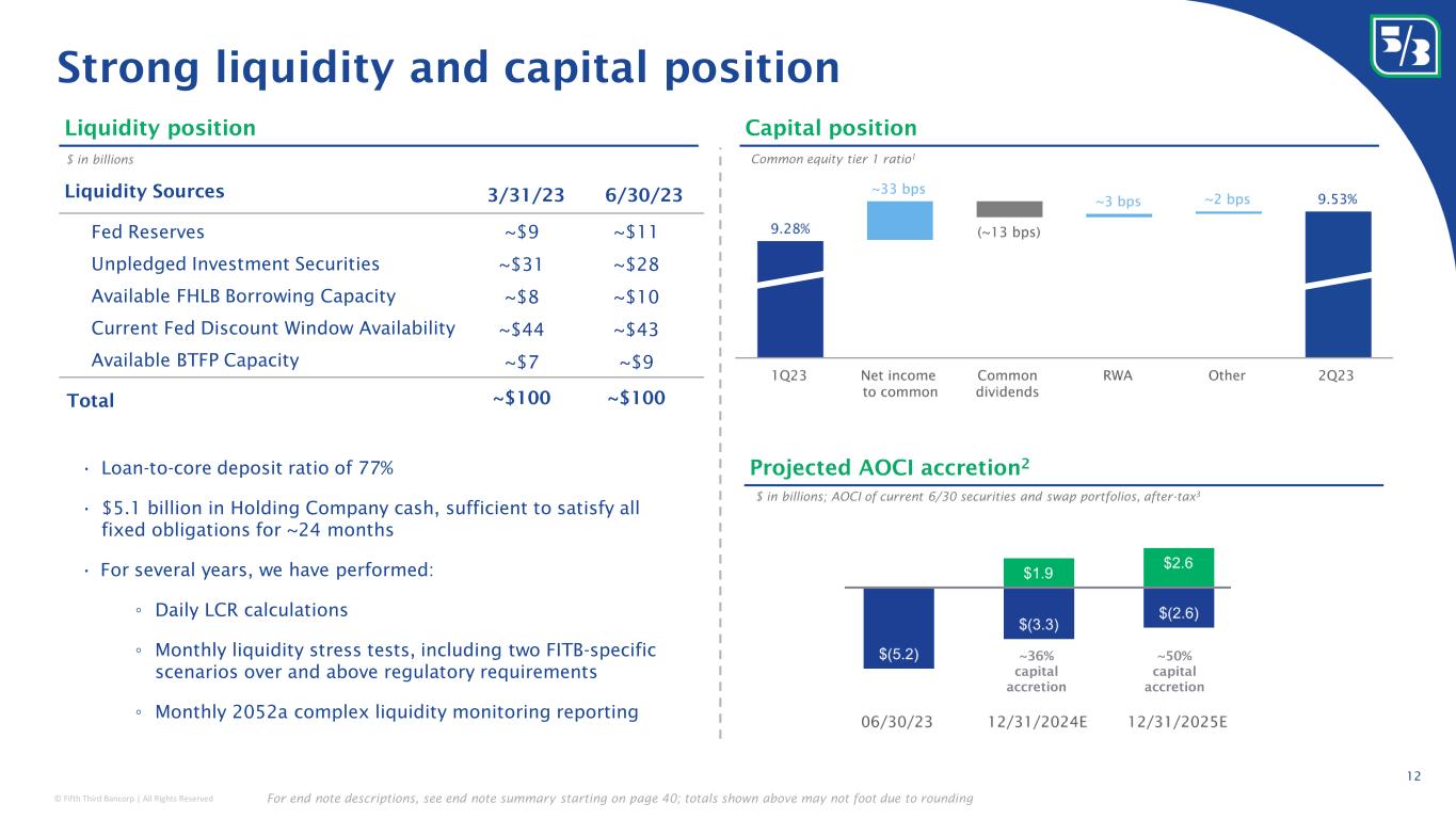 © Fifth Third Bancorp | All Rights Reserved 12 Strong liquidity and capital position • Loan-to-core deposit ratio of 77% • $5.1 billion in Holding Company cash, sufficient to satisfy all fixed obligations for ~24 months • For several years, we have performed: ◦ Daily LCR calculations ◦ Monthly liquidity stress tests, including two FITB-specific scenarios over and above regulatory requirements ◦ Monthly 2052a complex liquidity monitoring reporting Liquidity position $ in billions Fed Reserves Unpledged Investment Securities Available FHLB Borrowing Capacity Current Fed Discount Window Availability Total ~$11 ~$28 ~$10 ~$43 ~$100 3/31/23 Available BTFP Capacity ~$9 Capital position Common equity tier 1 ratio 1 Projected AOCI accretion 2 $ in billions; AOCI of current 6/30 securities and swap portfolios, after-tax 3 ~$9 ~$31 ~$8 ~$44 ~$100 ~$7 Liquidity Sources 6/30/23 For end note descriptions, see end note summary starting on page 40; totals shown above may not foot due to rounding ~36% capital accretion ~50% capital accretion