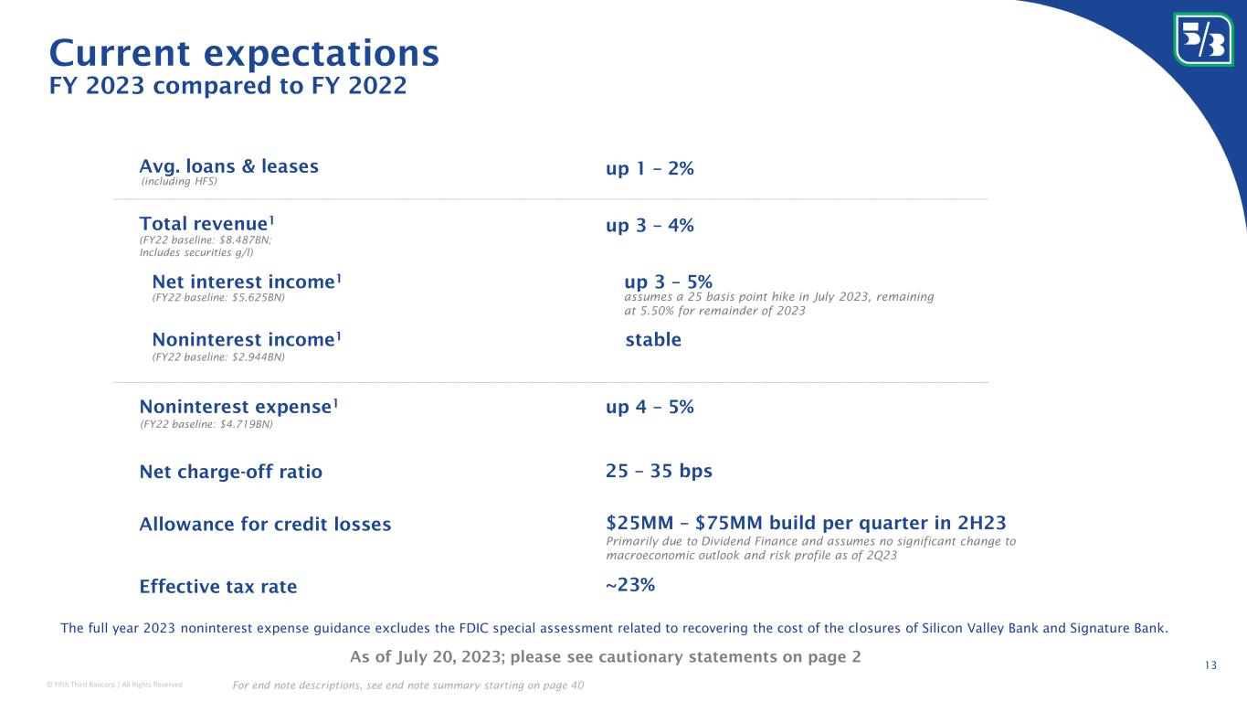 © Fifth Third Bancorp | All Rights Reserved Net interest income 1 Noninterest income 1 down 3 – 4% Noninterest expense 1 down 1 – 2% down 2 – 3% (2Q23 baseline: $1.463BN) (2Q23 baseline: $749MM) (2Q23 baseline: $1.213BN) Net charge-off ratio 35 – 45 bps Effective tax rate ~23% For end note descriptions, see end note summary starting on page 40 As of July 20, 2023; please see cautionary statements on page 2 Total revenue 1 down 2 – 4% (2Q23 baseline: $2.219BN; Includes securities g/l) (including HFS) Avg. loans & leases down 1 – 2% Current expectations 3Q23 compared to 2Q23 14 assumes a 25 basis point rate hike in July 2023 Allowance for credit losses $25MM - $75MM build The third quarter 2023 noninterest expense guidance excludes the FDIC special assessment related to recovering the cost of the closures of Silicon Valley Bank and Signature Bank. Primarily due to Dividend Finance and assumes no significant change to macroeconomic outlook and risk profile as of 2Q23