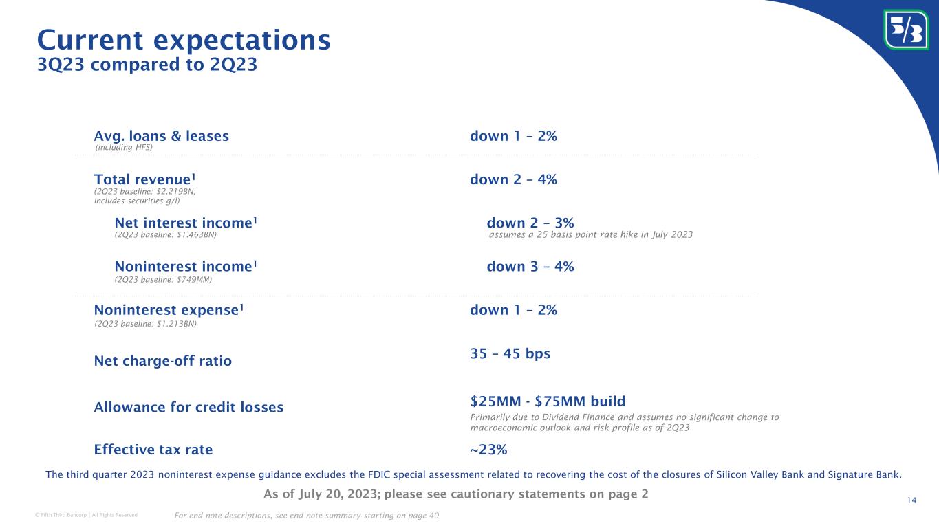 © Fifth Third Bancorp | All Rights Reserved up 3 – 5% Noninterest expense 1 up 4 – 5% (FY22 baseline: $4.719BN) Net charge-off ratio 25 – 35 bps Effective tax rate ~23% For end note descriptions, see end note summary starting on page 40 As of July 20, 2023; please see cautionary statements on page 2 Total revenue 1 up 3 – 4% (FY22 baseline: $8.487BN; Includes securities g/l) (including HFS) Avg. loans & leases up 1 – 2% Current expectations FY 2023 compared to FY 2022 13 assumes a 25 basis point hike in July 2023, remaining at 5.50% for remainder of 2023 Allowance for credit losses $25MM – $75MM build per quarter in 2H23 Primarily due to Dividend Finance and assumes no significant change to macroeconomic outlook and risk profile as of 2Q23 Net interest income 1 Noninterest income 1 stable (FY22 baseline: $5.625BN) (FY22 baseline: $2.944BN) The full year 2023 noninterest expense guidance excludes the FDIC special assessment related to recovering the cost of the closures of Silicon Valley Bank and Signature Bank.