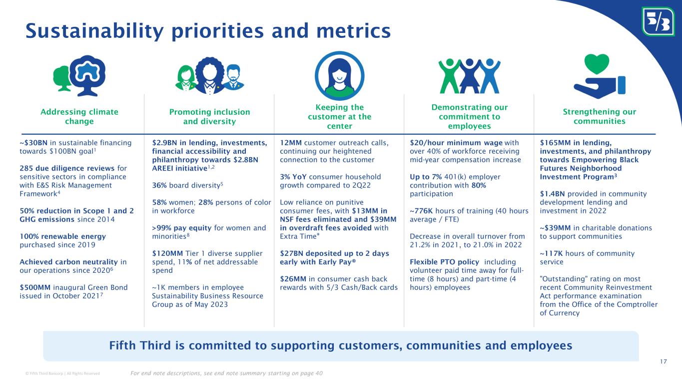 © Fifth Third Bancorp | All Rights Reserved 16 Our purpose, vision, and core values support our commitment to generating sustainable value for stakeholders Our Vision Be the One Bank people most value and trust Our Core Values Our Purpose To improve the lives of our customers and the well-being of our communities Work as One Bank Take Accountability Be Respectful Act with Integrity Living our purpose guided by our vision and values