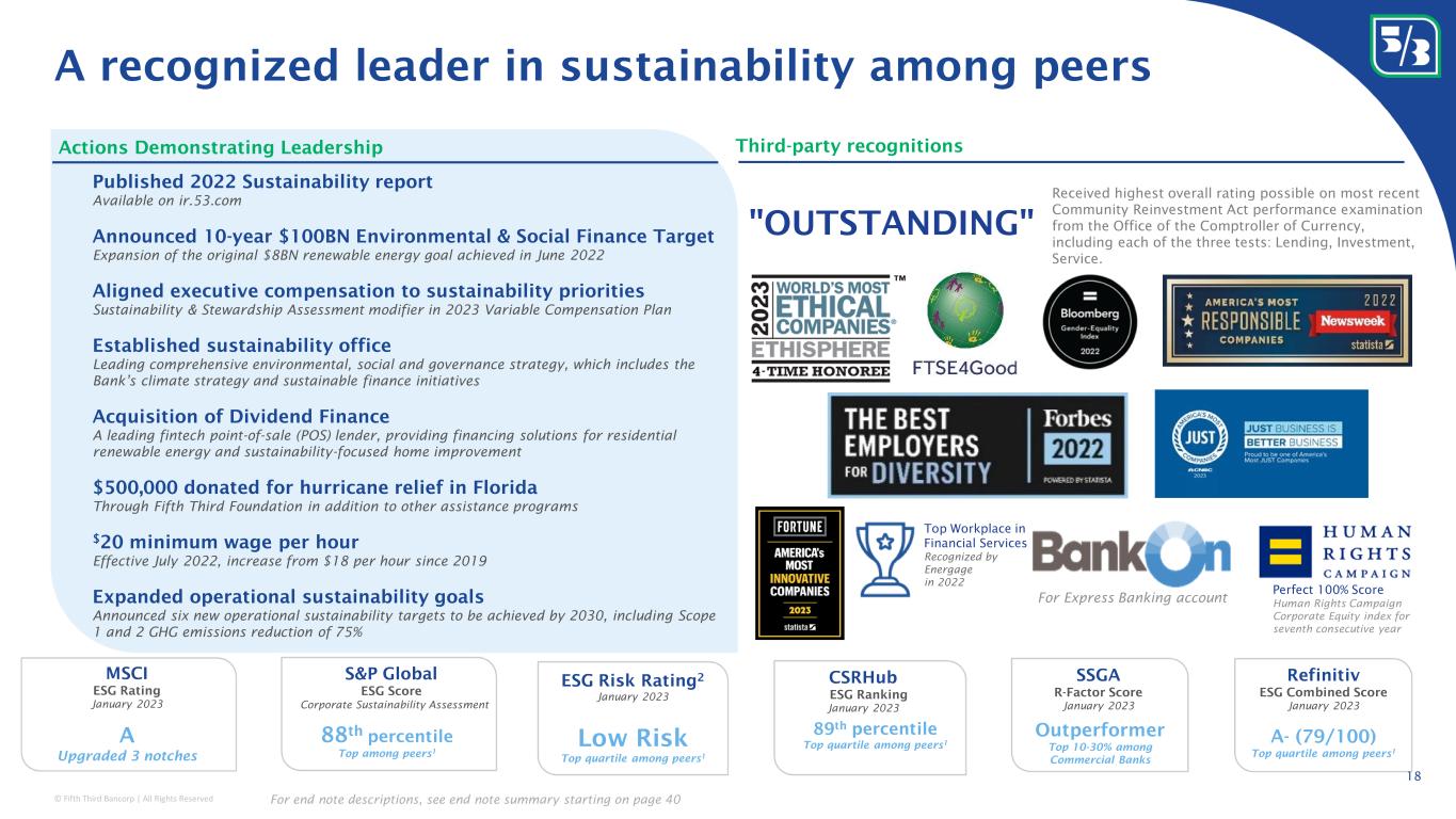 © Fifth Third Bancorp | All Rights Reserved 17 Addressing climate change Promoting inclusion and diversity Demonstrating our commitment to employees Strengthening our communities Keeping the customer at the center $165MM in lending, investments, and philanthropy towards Empowering Black Futures Neighborhood Investment Program 3 $1.4BN provided in community development lending and investment in 2022 ~$39MM in charitable donations to support communities ~117K hours of community service "Outstanding" rating on most recent Community Reinvestment Act performance examination from the Office of the Comptroller of Currency $20/hour minimum wage with over 40% of workforce receiving mid-year compensation increase Up to 7% 401(k) employer contribution with 80% participation ~776K hours of training (40 hours average / FTE) Decrease in overall turnover from 21.2% in 2021, to 21.0% in 2022 Flexible PTO policy including volunteer paid time away for full- time (8 hours) and part-time (4 hours) employees 12MM customer outreach calls, continuing our heightened connection to the customer 3% YoY consumer household growth compared to 2Q22 Low reliance on punitive consumer fees, with $13MM in NSF fees eliminated and $39MM in overdraft fees avoided with Extra Time ® $27BN deposited up to 2 days early with Early Pay® $26MM in consumer cash back rewards with 5/3 Cash/Back cards $2.9BN in lending, investments, financial accessibility and philanthropy towards $2.8BN AREEI initiative 1,2 36% board diversity 5 58% women; 28% persons of color in workforce >99% pay equity for women and minorities 8 $120MM Tier 1 diverse supplier spend, 11% of net addressable spend ~1K members in employee Sustainability Business Resource Group as of May 2023 ~$30BN in sustainable financing towards $100BN goal 1 285 due diligence reviews for sensitive sectors in compliance with E&S Risk Management Framework 4 50% reduction in Scope 1 and 2 GHG emissions since 2014 100% renewable energy purchased since 2019 Achieved carbon neutrality in our operations since 2020 6 $500MM inaugural Green Bond issued in October 2021 7 Fifth Third is committed to supporting customers, communities and employees For end note descriptions, see end note summary starting on page 40 Sustainability priorities and metrics