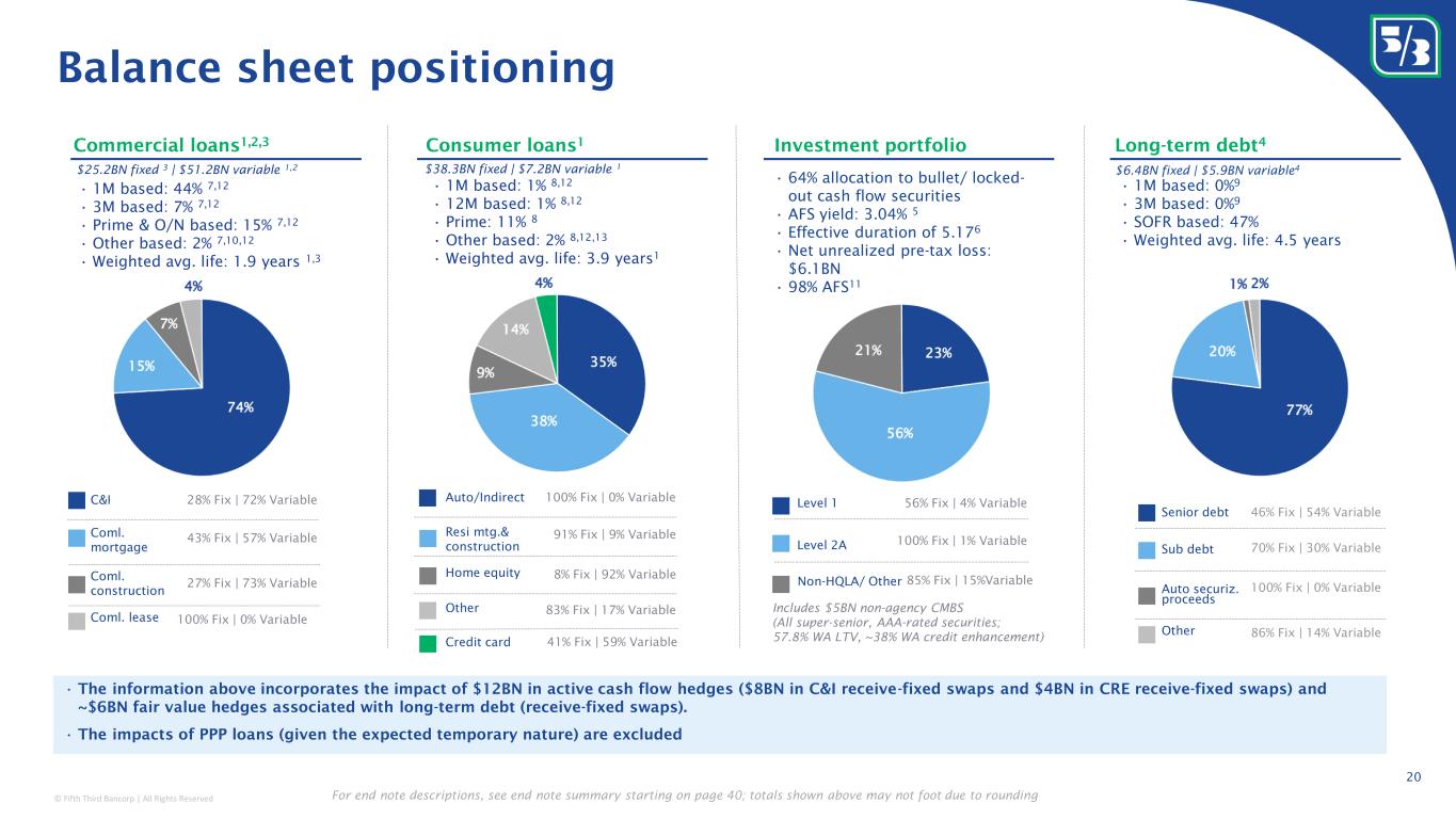 © Fifth Third Bancorp | All Rights Reserved • 64% allocation to bullet/ locked- out cash flow securities • AFS yield: 3.04% 5 • Effective duration of 5.17 6 • Net unrealized pre-tax loss: $6.1BN • 98% AFS 11 $25.2BN fixed 3 | $51.2BN variable 1,2 Commercial loans 1,2,3 Balance sheet positioning 100% Fix | 1% Variable 85% Fix | 15%Variable Investment portfolioConsumer loans 1 Long-term debt 4 $38.3BN fixed | $7.2BN variable 1 $6.4BN fixed | $5.9BN variable 4 • 1M based: 44% 7,12 • 3M based: 7% 7,12 • Prime & O/N based: 15% 7,12 • Other based: 2% 7,10,12 • Weighted avg. life: 1.9 years 1,3 • 1M based: 1% 8,12 • 12M based: 1% 8,12 • Prime: 11% 8 • Other based: 2% 8,12,13 • Weighted avg. life: 3.9 years 1 • 1M based: 0% 9 • 3M based: 0% 9 • SOFR based: 47% • Weighted avg. life: 4.5 years C&I 28% Fix | 72% Variable Coml. mortgage 43% Fix | 57% Variable Coml. lease 100% Fix | 0% Variable Resi mtg.& construction 91% Fix | 9% Variable Home equity 8% Fix | 92% Variable Senior debt 46% Fix | 54% Variable Sub debt 70% Fix | 30% Variable Auto securiz. proceeds 100% Fix | 0% Variable Coml. construction 27% Fix | 73% Variable Credit card 41% Fix | 59% Variable Other 83% Fix | 17% Variable Other 86% Fix | 14% Variable Level 1 56% Fix | 4% Variable Level 2A Non-HQLA/ Other • The information above incorporates the impact of $12BN in active cash flow hedges ($8BN in C&I receive-fixed swaps and $4BN in CRE receive-fixed swaps) and ~$6BN fair value hedges associated with long-term debt (receive-fixed swaps). • The impacts of PPP loans (given the expected temporary nature) are excluded Includes $5BN non-agency CMBS (All super-senior, AAA-rated securities; 57.8% WA LTV, ~38% WA credit enhancement) Auto/Indirect 100% Fix | 0% Variable For end note descriptions, see end note summary starting on page 40; totals shown above may not foot due to rounding 20