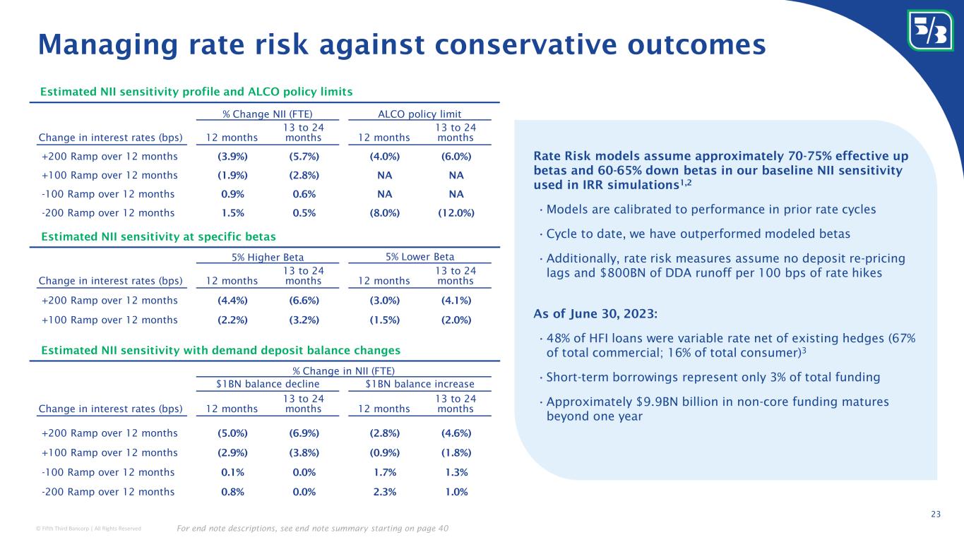 © Fifth Third Bancorp | All Rights Reserved Managing rate risk against conservative outcomes Estimated NII sensitivity profile and ALCO policy limits Estimated NII sensitivity at specific betas Rate Risk models assume approximately 70-75% effective up betas and 60-65% down betas in our baseline NII sensitivity used in IRR simulations 1,2 •Models are calibrated to performance in prior rate cycles •Cycle to date, we have outperformed modeled betas •Additionally, rate risk measures assume no deposit re-pricing lags and $800BN of DDA runoff per 100 bps of rate hikes As of June 30, 2023: •48% of HFI loans were variable rate net of existing hedges (67% of total commercial; 16% of total consumer) 3 •Short-term borrowings represent only 3% of total funding •Approximately $9.9BN billion in non-core funding matures beyond one year 23 % Change NII (FTE) ALCO policy limit Change in interest rates (bps) 12 months 13 to 24 months 12 months 13 to 24 months +200 Ramp over 12 months (3.9%) (5.7%) (4.0%) (6.0%) +100 Ramp over 12 months (1.9%) (2.8%) NA NA -100 Ramp over 12 months 0.9% 0.6% NA NA -200 Ramp over 12 months 1.5% 0.5% (8.0%) (12.0%) 5% Higher Beta 5% Lower Beta Change in interest rates (bps) 12 months 13 to 24 months 12 months 13 to 24 months +200 Ramp over 12 months (4.4%) (6.6%) (3.0%) (4.1%) +100 Ramp over 12 months (2.2%) (3.2%) (1.5%) (2.0%) Estimated NII sensitivity with demand deposit balance changes % Change in NII (FTE) $1BN balance decline $1BN balance increase Change in interest rates (bps) 12 months 13 to 24 months 12 months 13 to 24 months +200 Ramp over 12 months (5.0%) (6.9%) (2.8%) (4.6%) +100 Ramp over 12 months (2.9%) (3.8%) (0.9%) (1.8%) -100 Ramp over 12 months 0.1% 0.0% 1.7% 1.3% -200 Ramp over 12 months 0.8% 0.0% 2.3% 1.0% For end note descriptions, see end note summary starting on page 40
