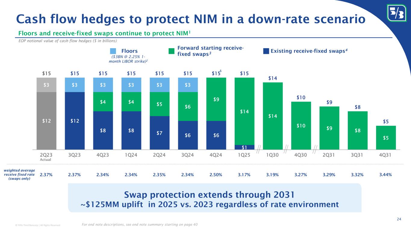 © Fifth Third Bancorp | All Rights Reserved Cash flow hedges to protect NIM in a down-rate scenario ($3BN @ 2.25% 1- month LIBOR strike) 2 Floors and receive-fixed swaps continue to protect NIM 1 EOP notional value of cash flow hedges ($ in billions) Actual For end note descriptions, see end note summary starting on page 40 Swap protection extends through 2031 ~$125MM uplift in 2025 vs. 2023 regardless of rate environment 24 Floors Forward starting receive- fixed swaps 3 Existing receive-fixed swaps 4 weighted average receive fixed rate (swaps only) 2.37% 2.37% 3.32%2.34% 2.34%2.34% 2.35% 2.50% 3.17% 3.19% 3.27% 3.29% 3.44% 5