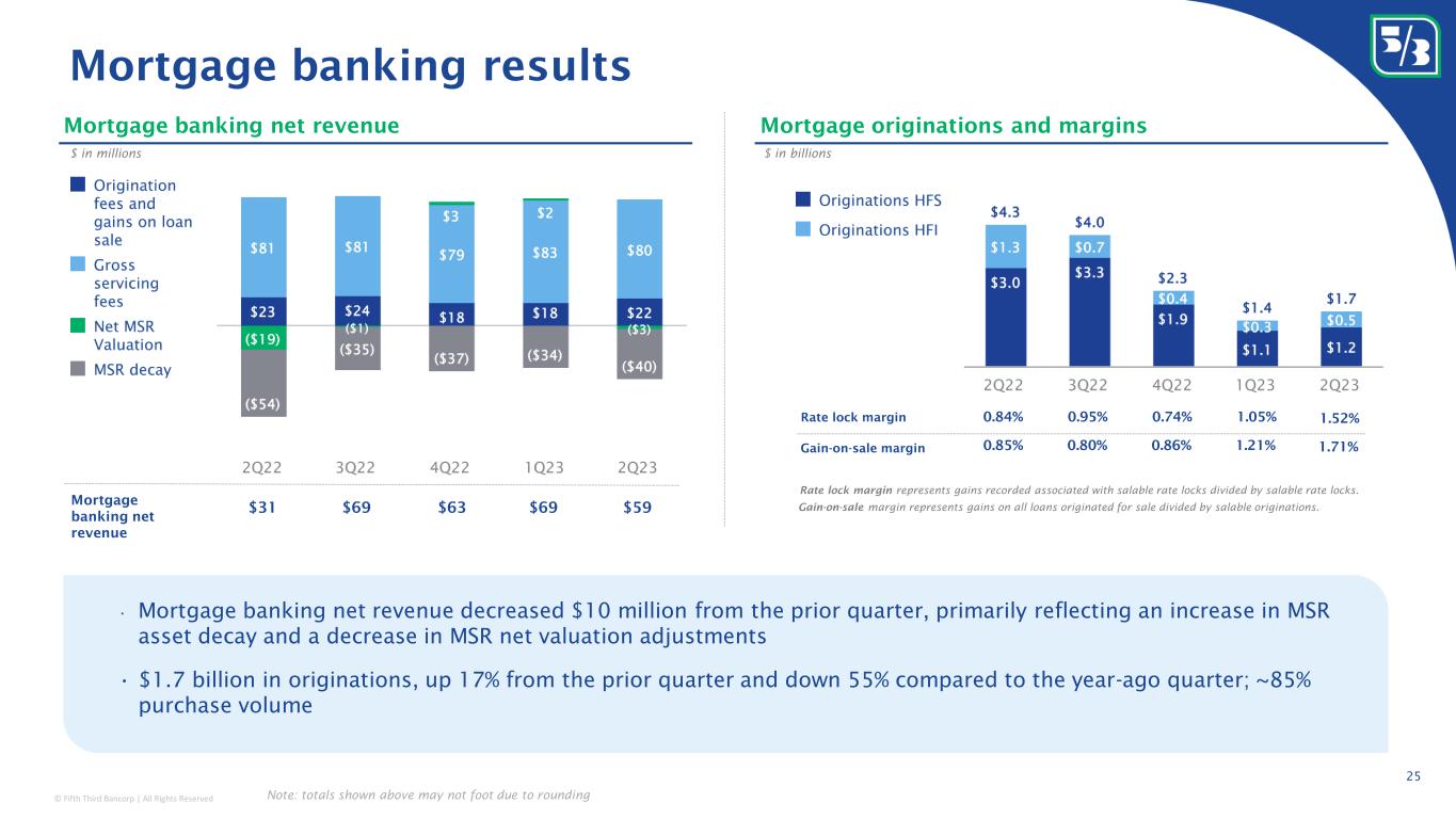 © Fifth Third Bancorp | All Rights Reserved Mortgage banking results $ in millions Mortgage banking net revenue Mortgage originations and margins • Mortgage banking net revenue decreased $10 million from the prior quarter, primarily reflecting an increase in MSR asset decay and a decrease in MSR net valuation adjustments • $1.7 billion in originations, up 17% from the prior quarter and down 55% compared to the year-ago quarter; ~85% purchase volume Note: totals shown above may not foot due to rounding $ in billions 0.84% 0.85% 0.95% 0.80% 0.74% 0.86%Gain-on-sale margin Gain-on-sale margin represents gains on all loans originated for sale divided by salable originations. Rate lock margin Rate lock margin represents gains recorded associated with salable rate locks divided by salable rate locks. 1.05% 1.21% 25 $31 $69 $63 $69 Mortgage banking net revenue $59 1.52% 1.71%
