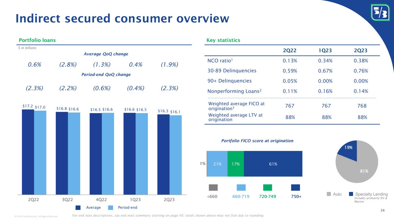 © Fifth Third Bancorp | All Rights Reserved 2Q22 1Q23 2Q23 NCO ratio 1 (0.06%) (0.04%) 0.06% 30-89 Delinquencies 0.56% 0.58% 0.61% 90+ Delinquencies 0.05% 0.03% 0.03% Nonperforming Loans 2 1.84% 1.72% 1.56% Weighted average FICO at origination 3 765 767 767 Weighted average LTV at origination 68% 67% 67% Home equity overview 33 Portfolio FICO score at origination 3 $ in billions Portfolio balances Key statistics Period-end QoQ change Average QoQ change For end note descriptions, see end note summary starting on page 40; totals shown above may not foot due to rounding (2.8%) 1.6% 1.7% (0.5%) (1.7%) (0.3%) 2.4% 1.0% (2.0%) (1.2%) 750+720-749<660 660-719 2% Period-endAverage